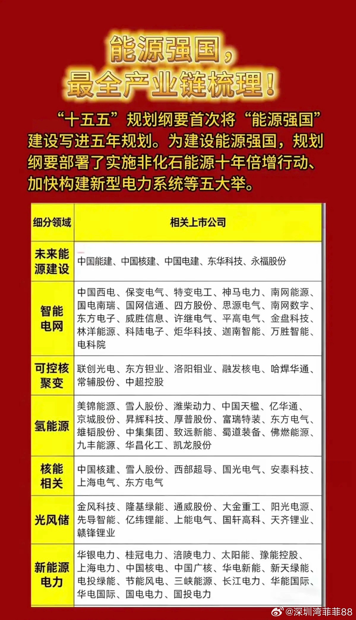 十五五规划纲要,首次将“能源强国”建设写进五年规划!1.未来能源2.智能电网3.可控核聚变4.氢能源5.核能相关6.光风储7.新能源电力相关核心龙头关联股: