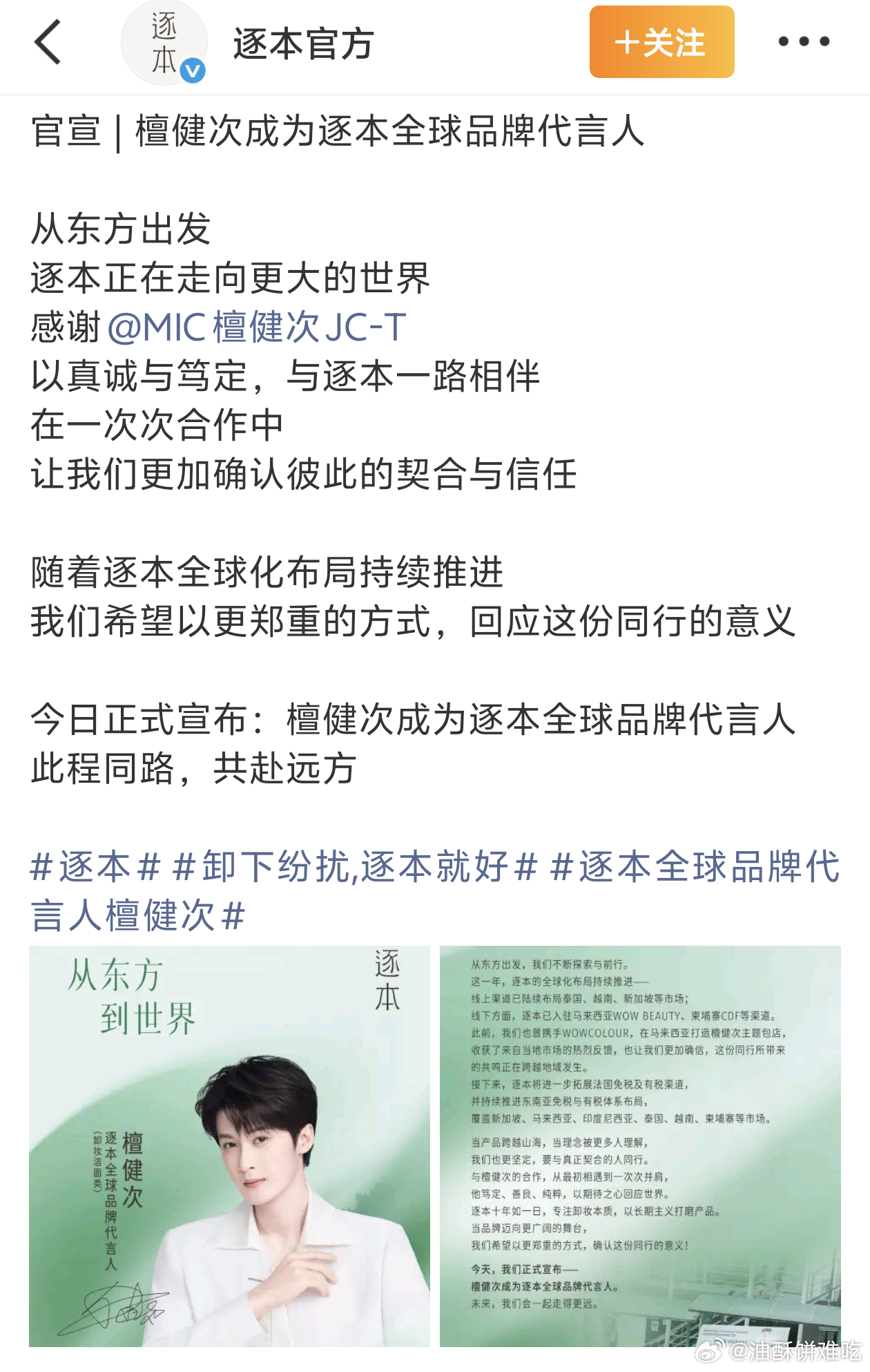 逐本官宣 檀健次成为逐本全球品牌代言人!恭喜升t,全球代➕1,商业价值杠杠的🎉🎉逐本全球品牌代言人檀健次