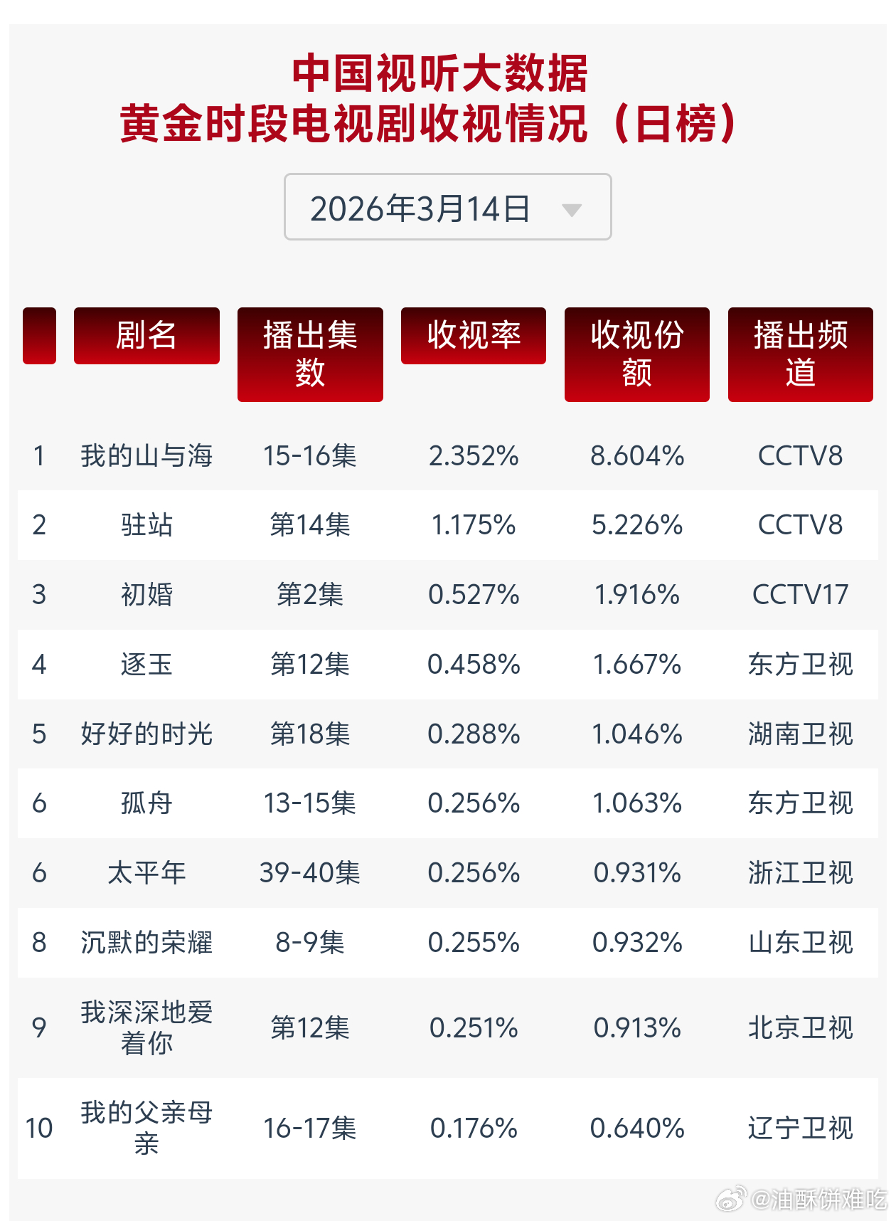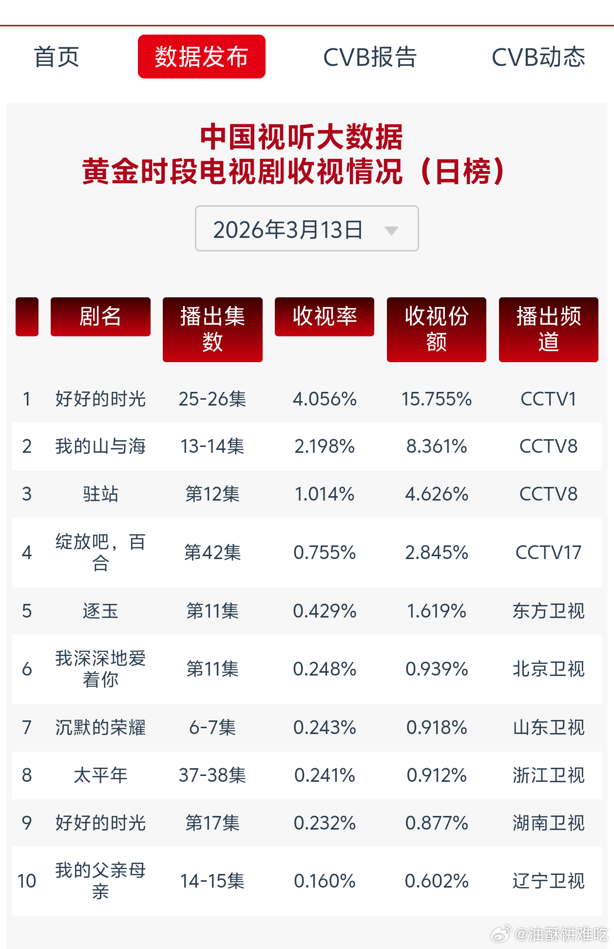 谭松韵的《我的山与海》cvb连续跳涨,目前央八暂年冠稳稳的,虽然才年初但这个收视