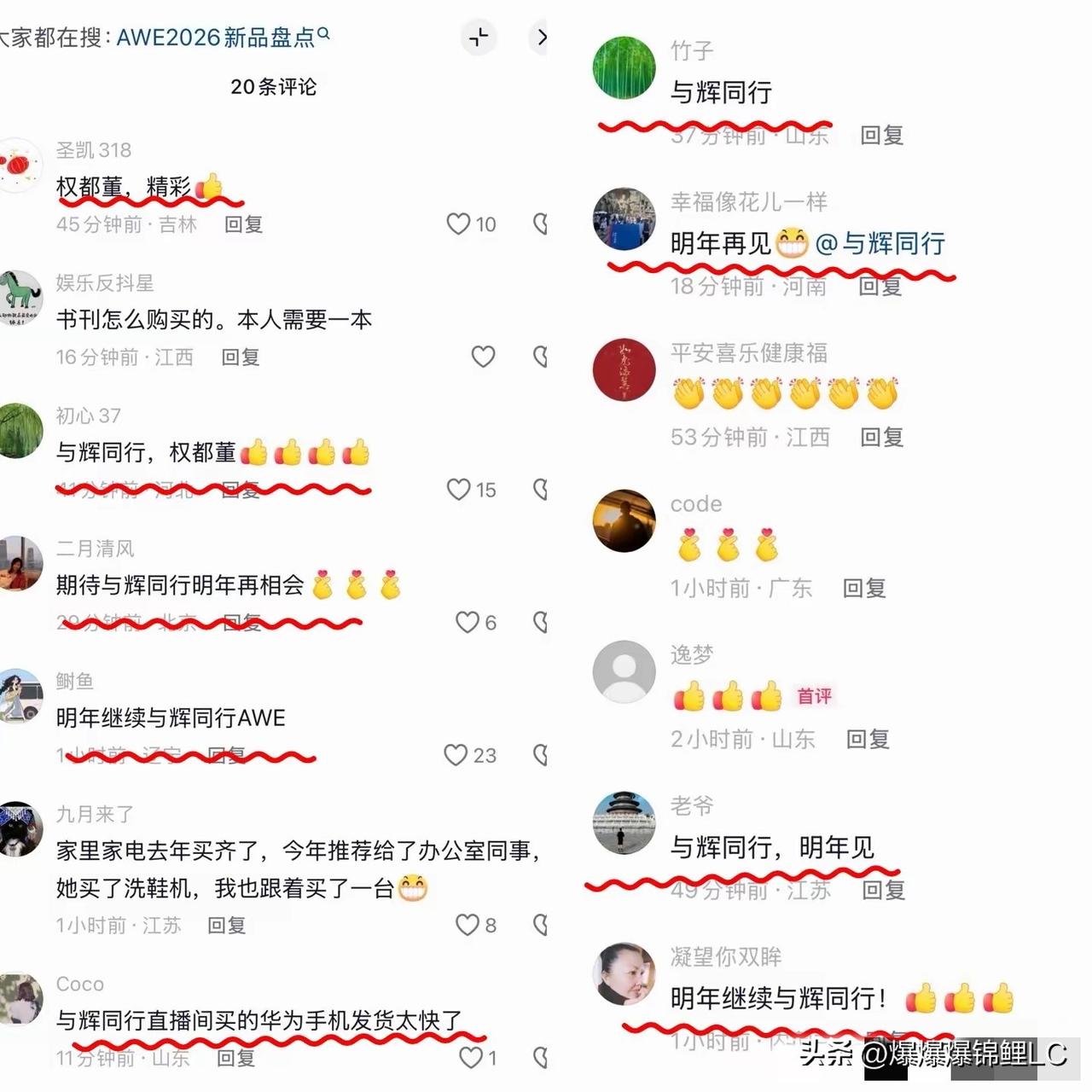 AWE2026刚完事,官方紧跟着就发了个致谢文。粗看就是常规客套,谁也没单拎出来夸。 但我觉着,这恰恰是主办方的高明之处。表面上一碗水端平,说是各路品牌和打工人共同努力的结果。 可你翻翻官方的账号,唯一的一条共创视频给了谁?直接给到了“与辉同行”。 这下咱们可算是看明白了,什么叫不点名的最高排面。人气担当这位置,根本不需要拿喇叭满街喊。 再瞅瞅底下的评论区,热度全砸在“与辉同行,明年见”这句留言上了。 群众的眼光毒着呢,谁带来的热度谁心里清楚。 一场大展会能搞成,底下人肯定没少熬夜掉头发。但能把这庞大的流量盘子端得这么稳。