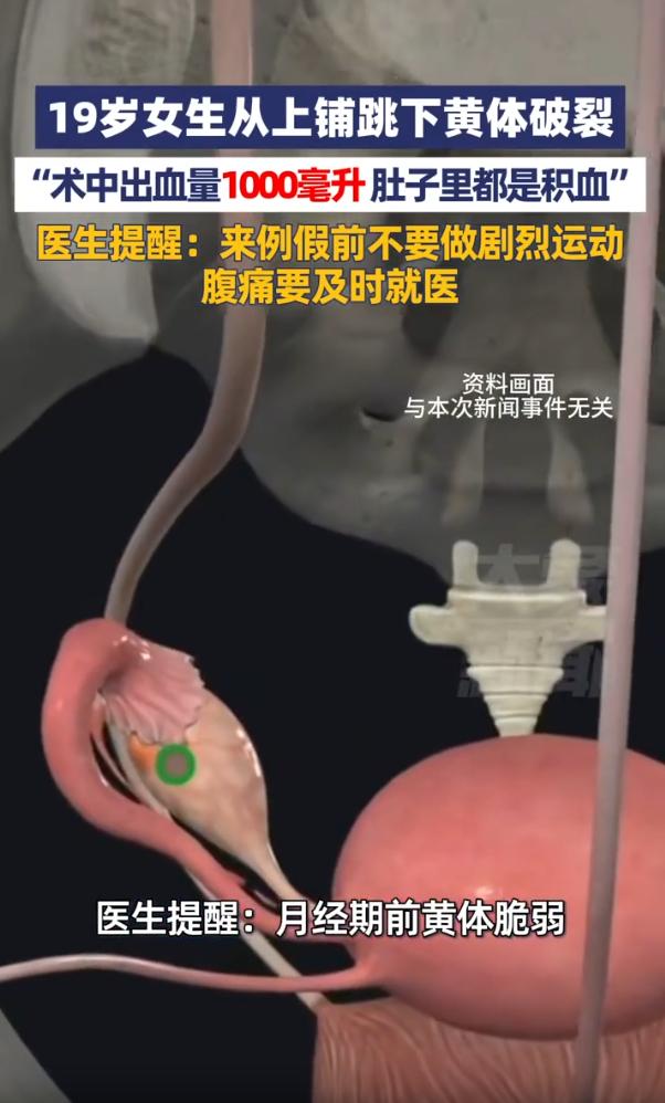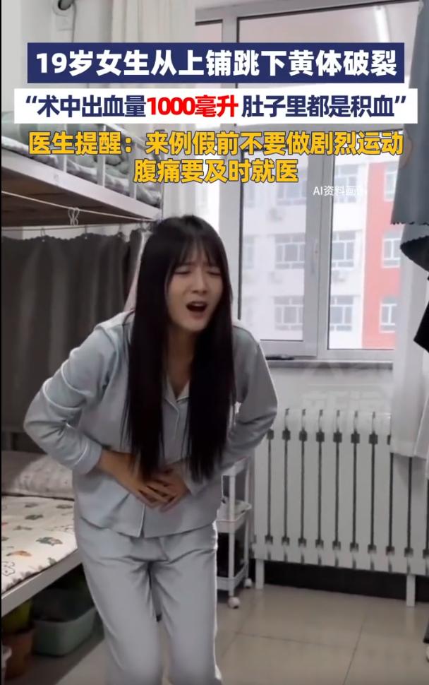 担心的事情还是发生了!河南郑州,一名19岁女生在宿舍休息时下床时,直接从上铺蹦了下来,没成想,平时常做的动作,这次过后却突然腹部剧痛,后来去医院检查,竟然确诊黄体破裂,医生紧急安排了手术 女生住在学校宿舍的上铺。跟很多年轻人一样,她下床不爱走梯子,图省事,直接往下一蹦。这个动作,她做过无数次,从来没出过事 但这一次,落地的一瞬间,肚子就开始不对劲了 那种疼,不是磕着碰着的表皮疼,是肚子里头翻江倒海的那种。女生开始还以为忍忍就过去了,结果疼得越来越凶,脸白得吓人,浑身发冷。室友一看情况不对,赶紧把她往医院送 到医院的时候,人已经快休克了。检查结果出来,连医生都有点意外,黄体破裂,肚子里头全是血,积血都快蔓延到肝脏那块儿了。手术的时候,从盆腔里清理出来的积血,足足有1000多毫升 啥概念?一个人全身的血,也就4000毫升左右。她这一下,流掉了将近四分之一 医生说这是凶险的妇科急腹症,再晚来一会儿,失血性休克真要人命。好在手术及时,血止住了,命保住了 这件事听完,可能很多人第一反应是:下个床也能下出人命? 确实,蹦床的人多了去了,怎么偏偏她就中了招?但事情没那么简单 黄体这东西,是女性每个月排卵之后,在卵巢上形成的一个临时内分泌结构。它本身没啥问题,但它有个特点,特别脆,血管又丰富。如果碰上它长得比较大的时候,稍微有点外力冲击、腹压突然升高,它就有可能破,一破,就是内出血 女生从上铺蹦下来那个瞬间,双脚着地,整个腹腔都会受到剧烈震动和压力冲击。这个冲击力传导到卵巢,刚好赶上黄体比较脆弱的那几天,它就破了 这事儿说到底,是两种情况的碰撞,一个常见的动作,碰上了一个特殊的生理期,结果就撞出了大问题 所以说,蹦床也好,剧烈运动也好,赶上那几天,该注意还得注意
