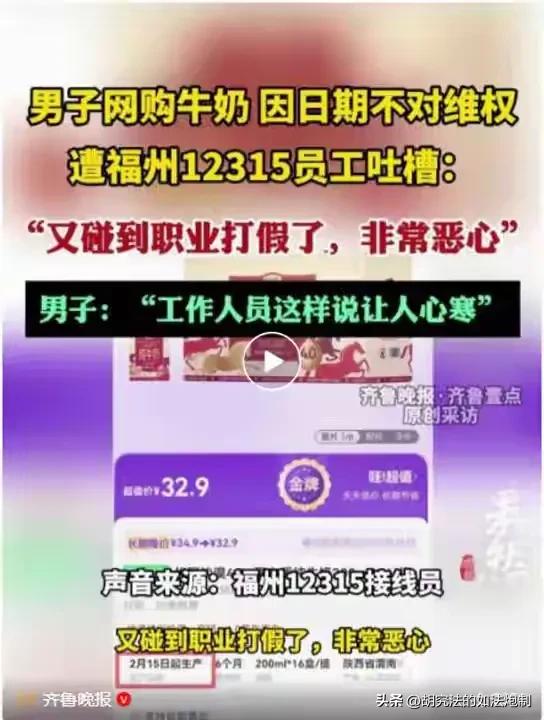 福建福州,一男子网购一箱牛奶,到货后发现生产日期差了7天,于是打了电话投诉。谁曾想,接线员给男子备案后,还没挂断电话,就嘲讽了句“又碰上职业打假的了,真恶心”。这句话刚好被男子听到,感到一阵心塞。网友:到底是谁恶心? 明明自己是反映问题的,没想到反映完问题却被接线员一阵嘲讽,穆先生的心里别提有多难受了。 事情还要从几天前说起,穆先生从网络平台上购买了一箱牛奶,在商品详情页上显示是2月15日起生产的。 穆先生也是一个讲究人,花同样的钱肯定买最新鲜的才合算,于是便痛痛快快的下单了。 货收到之后,穆先生第一时间就查看生产日期,结果发现生产日期竟然是2月8日生产的,这些与商品详情页上的标注日期不一致。 作为消费者来说,肯定希望自己买到的商品都符合自己的预期。虽然生产日期仅仅差了7天,而且也处于保质期的范围之内,可穆先生总觉得心里过不去这个坎,于是便主动客服进行反馈。 可客服听到穆先生的诉求之后,也是爱搭不理的态度,这可把穆先生给气坏了,想着一定要给自己讨一个说法才行。 既然商家不管,那就别怪消费者无情了。穆先生反手便打了12315热线进行投诉。 很快便有接线员接通了穆先生的电话,在听完穆先生的诉求之后,接线员语气温和,不急不躁,说是会帮穆先生记录在案,会进一步向上面反映。 同时提醒穆先生,由于受理需要一定的时间,还希望穆先生不要着急,耐心等待即可。 对方的话,让穆先生如沐春风,原本烦躁的心情也放松了很多。 可就当穆先生以为自己出了一口恶气时,接下来发生的事情让穆先生不淡定了。 处理完问题之后,接线员还以为已经挂断了电话,于是便和身边的同事聊起了这件事情。 “又碰上这些打假的了,可真恶心!” 电话那边还传来一阵嬉笑的声音。 而接线员说的这些话,一字不差的全部进了穆先生的耳朵里。 作为消费者,有投诉反映问题的权利,接线员是协助消费者进行维权的,怎么还被接线员给阴阳怪气了呢? 穆先生先是一脸的不敢相信,可接线员的那一句话,就像针一样,深深的扎进了穆先生的心里。 他就是一个普普通通的消费者,根本就不是接线员所说的是职业打假人,靠着打假来牟取利益。 打这个电话就是单纯的想督促商家进行整改,怎么还被接线员这么说呢? 无处宣泄的穆先生把自己的经历发布在了网络上,很快便引起了网友的热议。 有人说,就算是职业打假人又能如何呢?其实多亏了他们,才让我们这些普通人免受假货假食品的伤害,才打击了那些不良商家的嚣张气焰。虽然职业打假人的目的是为了获取利益,可他们打击的都是不良商家,这还能有什么错? 怪不得假货永远打不干净,不是因为造假者胆子大,而是有人爱管不管,你要是管了他还嫌你事多! 看不懂穆先生为什么会打这一次的投诉电话,2月8号生产的牛奶和2月15号生产的牛奶有什么区别吗?都是在保质期内,也不是三无产品,更不是伪劣产品,穆先生直接打电话投诉,有点小题大做了。 《民法典》第1024条规定,民事主体享有名誉权。任何组织或个人不得以侮辱、诽谤等方式侵害他人名誉权。 穆先生的本意就是想督促商家进行整改,却被接线员误以为是职业打假人。接线员的无端猜测无疑是对穆先生的一种侮辱,一定程度上伤害了穆先生的自尊心。 尤其是作为有关部门的工作人员,如此态度,不仅仅是一种不负责任的表现,更会打击到那些真正有需求的人的积极性。 有关部门已经对涉事的接线员进行了批评,并且在内部举一反三,对所有接线员进行了教育培训。 对此你怎么认为?