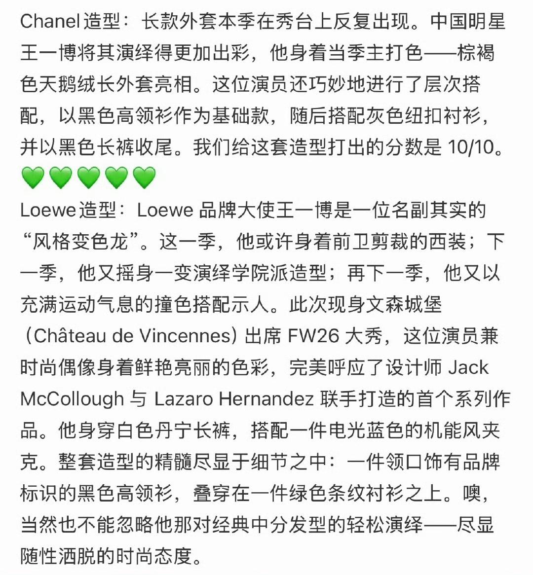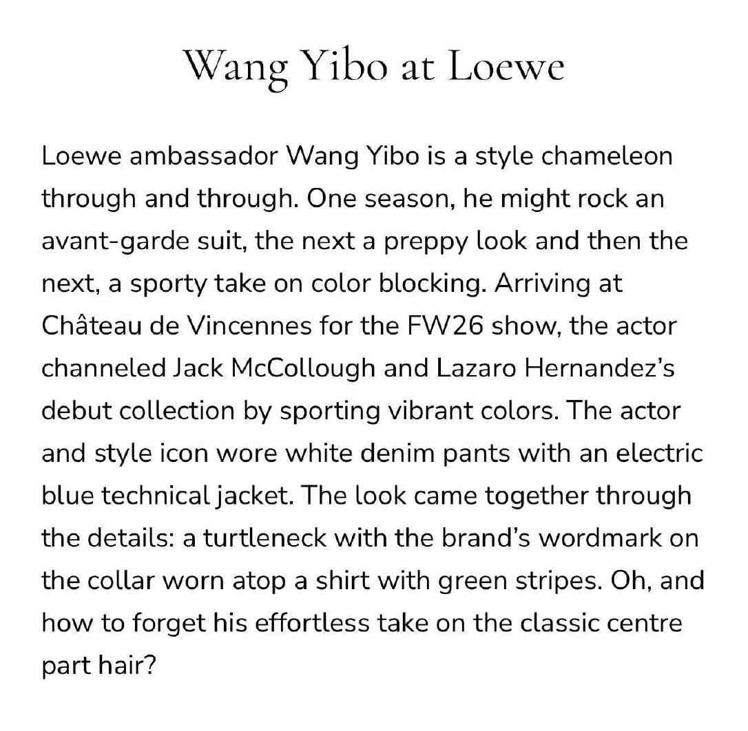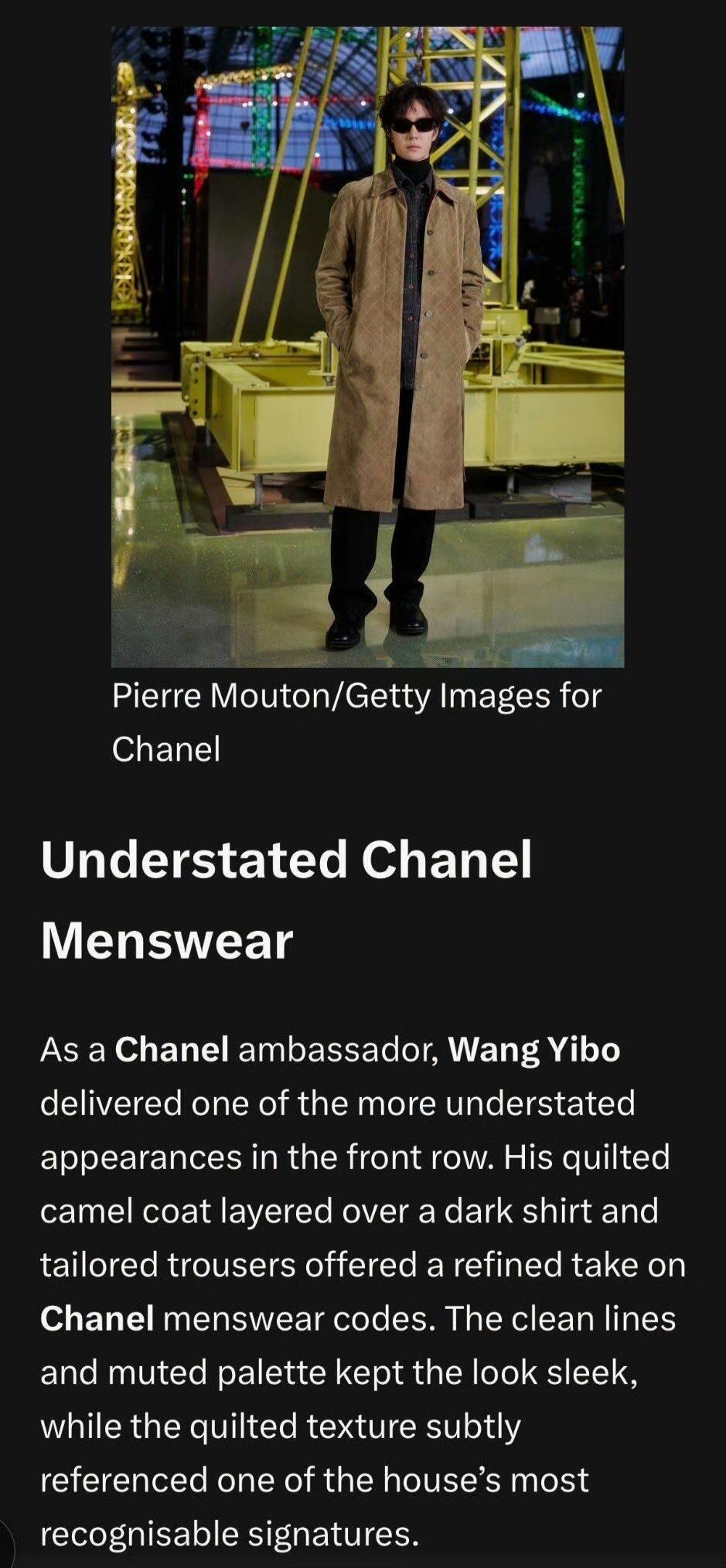 王一博,巴黎时装周满分男[赞]。 “军书十二卷,卷卷有爷名”,只要是点评回顾巴黎时装周,那肯定少不了王一博。 No manners magazine点评王一博:Chanel造型和王一博Loewe造型——满分男。 RCFA也点评了香奈儿大秀主要嘉宾的造型,王一博做为唯一男性嘉宾在列: 作为香奈儿品牌大使,王一博以一身格外低调的造型亮相秀场头排。他身着驼色绗缝大衣,内搭深色衬衫,下身搭配剪裁利落的长裤,演绎了精致考究的香奈儿男装风格。利落的线条与柔和的色调让整体造型干练流畅,而大衣的绗缝纹理则巧妙呼应了品牌最具辨识度的经典元素之一。 毫不夸张,王一博是完美诠释香奈儿的那个男人,没有之一,他赋予香奈儿的绝不仅仅在于外在的造型,更有内在的灵魂。