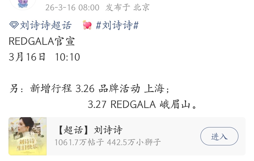 刘诗诗三月新增🍠春日大使还要参加REDGALA峨眉山活动盛典