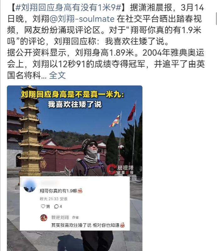 刘翔,冲上热搜! 3 月 14 日深夜,许久没有消息的刘翔,连夜冲上热搜,原因是他一个举动,不仅暴露了自己的真实身高,也让网友 get 到了他的幽默感。 家人们谁懂啊,刷到这条热搜的时候,我第一反应是又惊又喜,毕竟我们的 “亚洲飞人” 刘翔,真的太久没出现在公众视野里了,而且谁能想到,这次他炸上热搜,既不是什么重磅赛事官宣,也不是什么商业活动站台,居然是靠一句玩梗的评论,直接让全网网友直呼 “翔哥也太会了!” 原来起因是刘翔在社交平台晒出了自己的踏春日常,画面里的他,在山林间慢悠悠散步,在古寺前驻足停留,一身简单的休闲装,戴着口罩,整个人的状态松弛到了骨子里,完全没有半点奥运冠军的架子,就像身边随处可见的、出来散心的普通大哥。 可谁能想到,这条安安静静的日常视频,评论区居然被 “身高梗” 彻底占领了。 有网友在评论区好奇追问:“翔哥你真的有 1.9 米吗?” 结果刘翔本人居然亲自下场翻牌回应,一句 “其实我喜欢往矮了说,相对你也知道。” 直接把全网网友都逗乐了。 有没有跟我一样,看到这句回应直接笑出声的? 咱就是说,现在内娱的明星,为了身高能卷到什么地步?红毯上偷偷垫几层内增高,公开资料里的身高能比实际身高硬报出 5 厘米不止,甚至同框的时候为了显高,各种歪身子、垫脚的小心机层出不穷,生怕别人看出自己的真实身高。可到了刘翔这,官方公开资料里的身高明明白白写着 1.89 米,就差 1 厘米就能摸到 1.9 米的门槛,他反而大大方方说自己 “喜欢往矮了说”,这反差感,这格局,一下就把那些天天在身高上玩小心机的明星甩了八条街好吗! 也难怪网友们纷纷调侃,飞人不仅跨栏速度快,玩梗接梗的速度更是一绝,严肃了半辈子的奥运冠军,私下里居然是这么接地气又可爱的人。可笑着笑着,我突然就有点鼻酸,因为我们好像,用了太多年,才终于看到了刘翔最真实的样子。 说起刘翔,哪个 8090 后的青春里,没有他的名字?2004 年雅典奥运会的田径赛场,21 岁的刘翔,在全世界的注视下,以 12 秒 91 的成绩冲过男子 110 米栏的终点线,夺得奥运冠军,追平了保持多年的世界纪录。那一刻,整个中国都沸腾了,他成了中国田径史上第一个男子奥运冠军,更是打破了欧美选手对短跨项目长达几十年的垄断,告诉全世界:黄种人,也能在田径短道项目上,站在世界之巅。 很多人只记得雅典的封神一战,却不知道,刘翔的职业生涯,到底有多传奇。2006 年洛桑田径超级大奖赛,他以 12 秒 88 的成绩,打破了保持 13 年之久的世界纪录;他是世界田径史上,唯一一个集奥运会冠军、世锦赛冠军、世界纪录保持者于一身的男子 110 米栏大满贯得主。 整个职业生涯,他参加了 48 次世界大赛,拿下了 36 次冠军、6 次亚军、3 次季军,也就是说,他只要站上赛道,几乎就不会让奖牌旁落。 可就是这样一个创造了无数奇迹的英雄,却因为 2008 年北京奥运会、2012 年伦敦奥运会的两次退赛,被推上了风口浪尖,一夜之间从万众敬仰的飞人,变成了被全网谩骂的 “刘跑跑”。我到现在都记得,当年铺天盖地的骂声,有人撕了他的海报,有人骂他收了天价广告费却临阵脱逃,有人连他的家人都不放过,极尽嘲讽和网暴。可没人愿意听,他的跟腱已经伤得有多严重,没人愿意看,他为了能站上家门口的赛道,付出了多少常人无法想象的努力,大家只记住了他两次转身离开的背影,忘了他曾经给整个中国,带来过多少荣光和骄傲。 而刘翔呢,哪怕被全网误解,被骂了这么多年,他从来没有为自己辩解过一句,没有卖过惨,没有消费过自己的冠军光环。 退役之后,他直接淡出了公众视野,不直播带货,不接乱七八糟的综艺炒人设,不靠着当年的功绩吃老本,就安安静静过自己的小日子,去旅行,去踏春,去感受生活,偶尔在社交平台分享日常,和网友开开玩笑着玩梗,活成了最松弛的样子。 这次他因为一句身高梗冲上热搜,评论区再也没有当年的谩骂和指责,全是满满的善意和喜爱,大家笑着调侃他的幽默,怀念着他当年的传奇。其实这不仅是大家终于读懂了刘翔,更是我们终于学会了,不再用一次成败去定义一个人的一生,不再把一个运动员强行推上神坛,又在他受伤的时候狠狠摔下来。 从赛场上风一样的飞人,到生活里会玩梗的幽默大叔,刘翔拿得起巅峰的万丈荣光,也扛得住低谷的漫天非议,如今活成了自己最舒服的样子。他用自己的人生告诉我们,真正的强大,从来不是永远站在顶峰,而是看过繁华,受过诋毁,依然能守住本心,活成最松弛、最真实的自己。