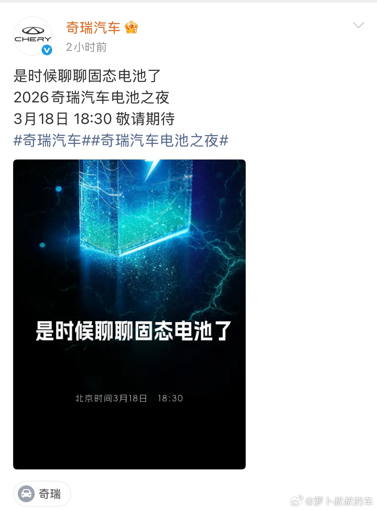 啥情况?奇瑞固态要这是要上了?北京时间3月18日18:30,如果这场电池之夜,但