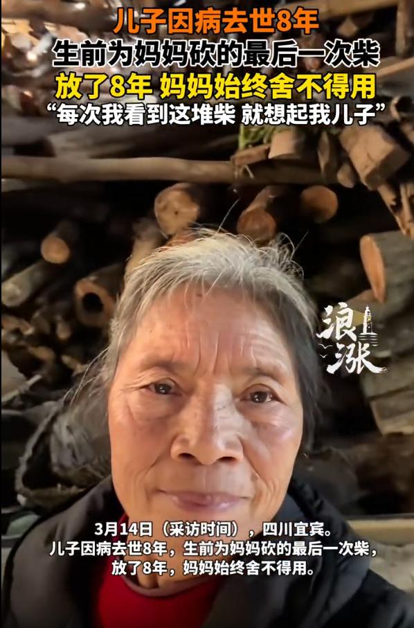 看哭了!四川宜宾,一位老人晒出和一堆柴的合影看哭网友,原来,这些柴是儿子生前最后一次为妈妈砍的,儿子离开了8年,老人就把这些柴放置了8年,每次看到这些柴,就感觉想起了儿子 视频中,老人的头发都已经白了,但是和身后的柴拍照合影时,却能看到眼睛里有光,还会挤出笑容 老人说,每次看到这堆柴,就好像看到儿子过年回家时的样子。儿子生前有个习惯,每次要出远门打工,都会提前给她备好一年的柴火,生怕她一个人在家没柴烧。这最后一堆柴,她舍不得动,就这么放着,放着放着,八年就过去了。 视频底下,评论区全是泪目 有人说,我外婆走的时候,我小舅砍的柴也还在,我小舅走了十几年了。有人说,这哪是柴啊,这是当妈的心头肉。也有网友劝,大嫂,该用就用掉吧,天天看着,心里更难过 可话说回来,这柴,换成谁舍得烧? 那不只是柴。那是儿子最后一次出力流汗,是儿子最后一次想着妈,是儿子留给这个世界的最后一点念想。烧了,就真没了。放着,至少每天看见,还能骗自己一句,他还在 我倒是想起老家一个奶奶。她儿子早年外出打工出了事,她每年过年还给他包饺子,煮好了端到他以前睡的那间屋,放一会儿,再端出来自己吃。别人问,她就说,他忙,回不来,我替他吃 人走了,活着的人该怎么继续活?这问题没有标准答案。有人选择放下,有人选择留着。留着的人,不是放不下,是不想放。那点念想,是疼,也是暖 这堆柴火,某种意义上,就是老人和儿子之间的那根线。线还在,人就还没走远 说实话,我也想过,要是换成我,我可能也舍不得烧。但我又觉得,也许哪天老人想通了,会挑一个冷得厉害的冬天,抽一根出来,点着,看着火苗往上蹿,然后说一句,儿啊,妈暖和了,你放心吧 那火,烧的是柴,暖的是心,送的是人