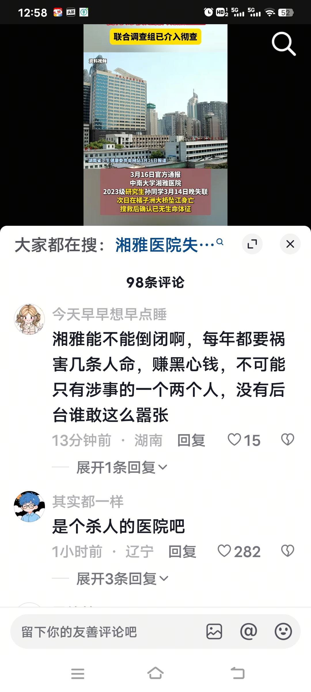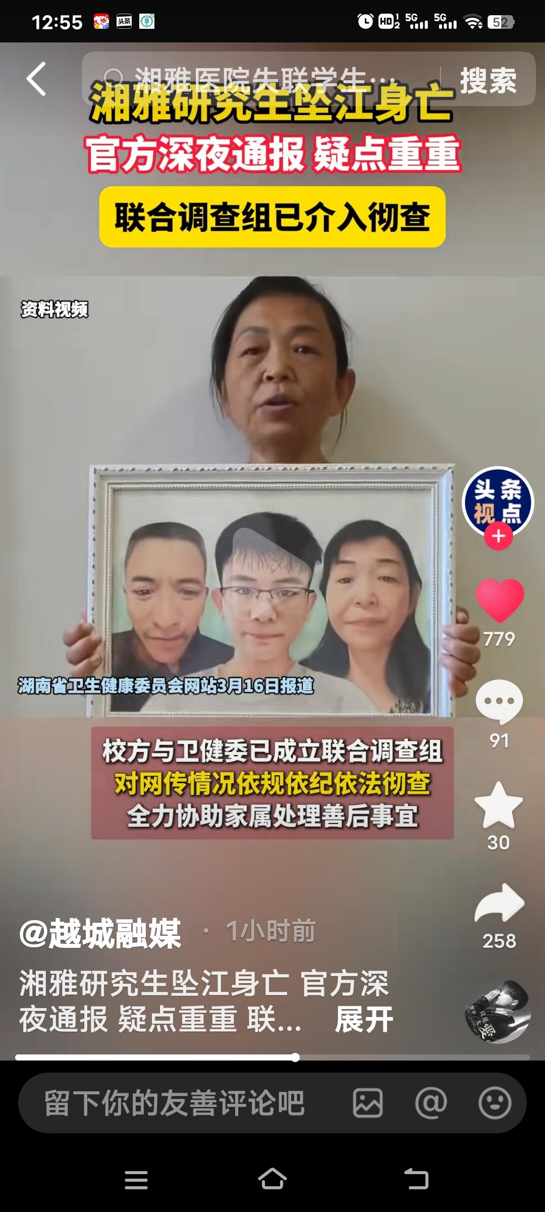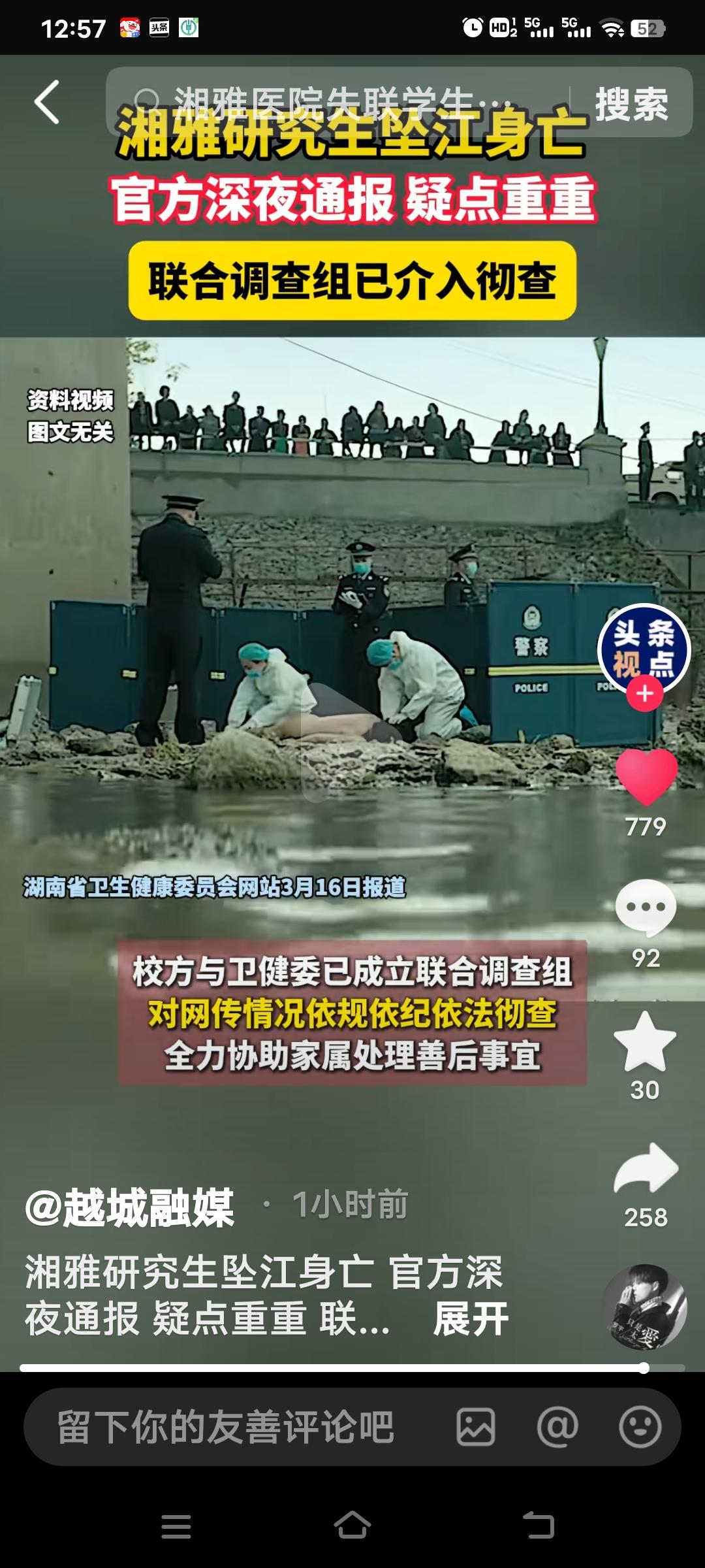 可惜了,又是一个年轻的生命消失了。中南大学湘雅医院研究生坠江身亡,官方深夜通报看似清晰,实则疑点重重。 通报里仅给出了时间线,孙同学从离开宿舍到坠江,14日晚上失联。16日官方就通报身亡了。这中间究竟发生了什么?学校组织寻找是如何进行的,效率怎样?警方发现坠江者的依据是什么,有没有可能存在其他隐情? 而且,对于孙同学坠江的原因只字未提。评论区里有很多网友对湘雅医院很不满呦,说每年都要祸害几条人命。这到底是怎么回事呀?很多人都替这个年纪的研究生感到可悲。父,母的心情就更不要提了! 一个研究生,本应有着美好的未来,却以这样的方式结束生命,背后或许藏着不为人知的故事。希望联合调查组能真正彻查,给家属和大众一个真相。 湘雅医疗事故 浙大博导坠亡 大学生坠楼事故