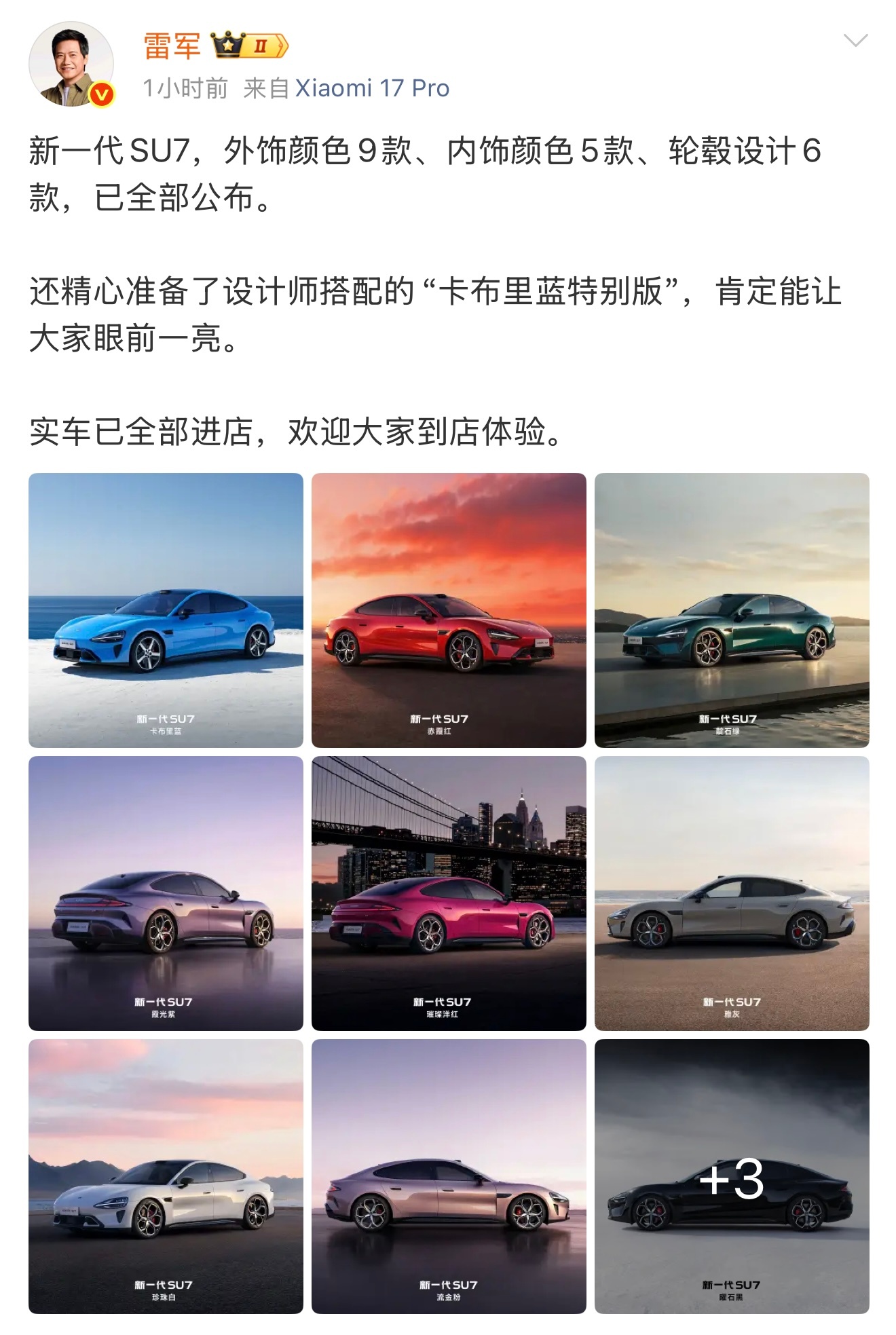 刚刷到雷总爆料,新一代SU7不仅有9款外饰色,还为用户准备了设计师主推的“卡布里蓝特别版”,轮毂到内饰都是专属卡布里蓝搭配,有点高定那味了。其实之前新一代SU7刚曝光的时候,我就觉得卡布里蓝配色是真的很好看,尤其是这几天我去线下看了实车以后,发现质感完全不是照片能比的,那种介于深邃和通透之间的层次感,阳光下泛着淡淡珠光,阴天时又沉稳得像深海,绝对属于人群中一眼锁定那种,真的很帅小米新SU7卡布里蓝特别版