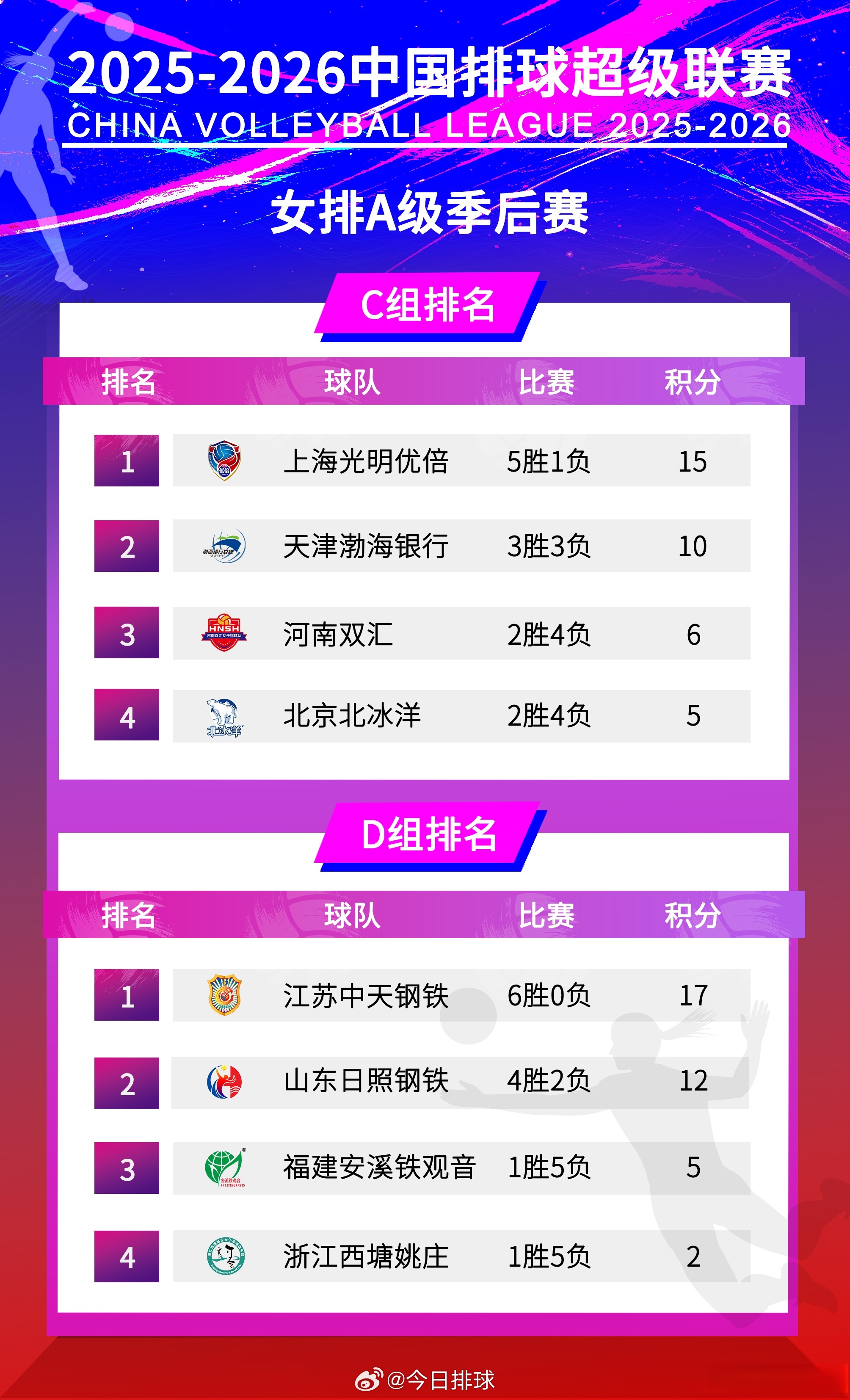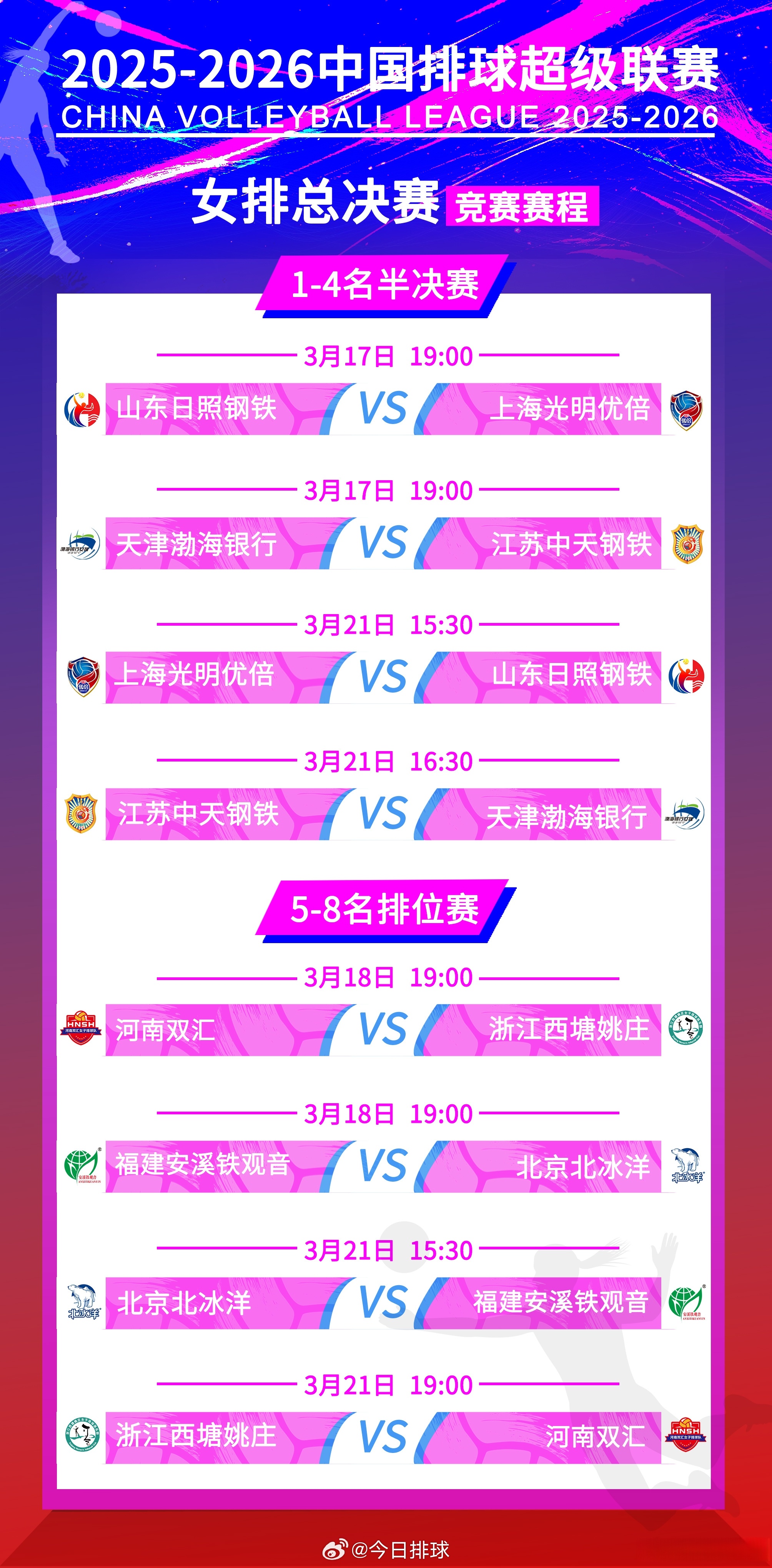 2025-2026中国女排超级联赛 A级总决赛本周二起展开,半决赛和5~8名排位赛交叉赛首回合的竞赛日程如下(主队在前):