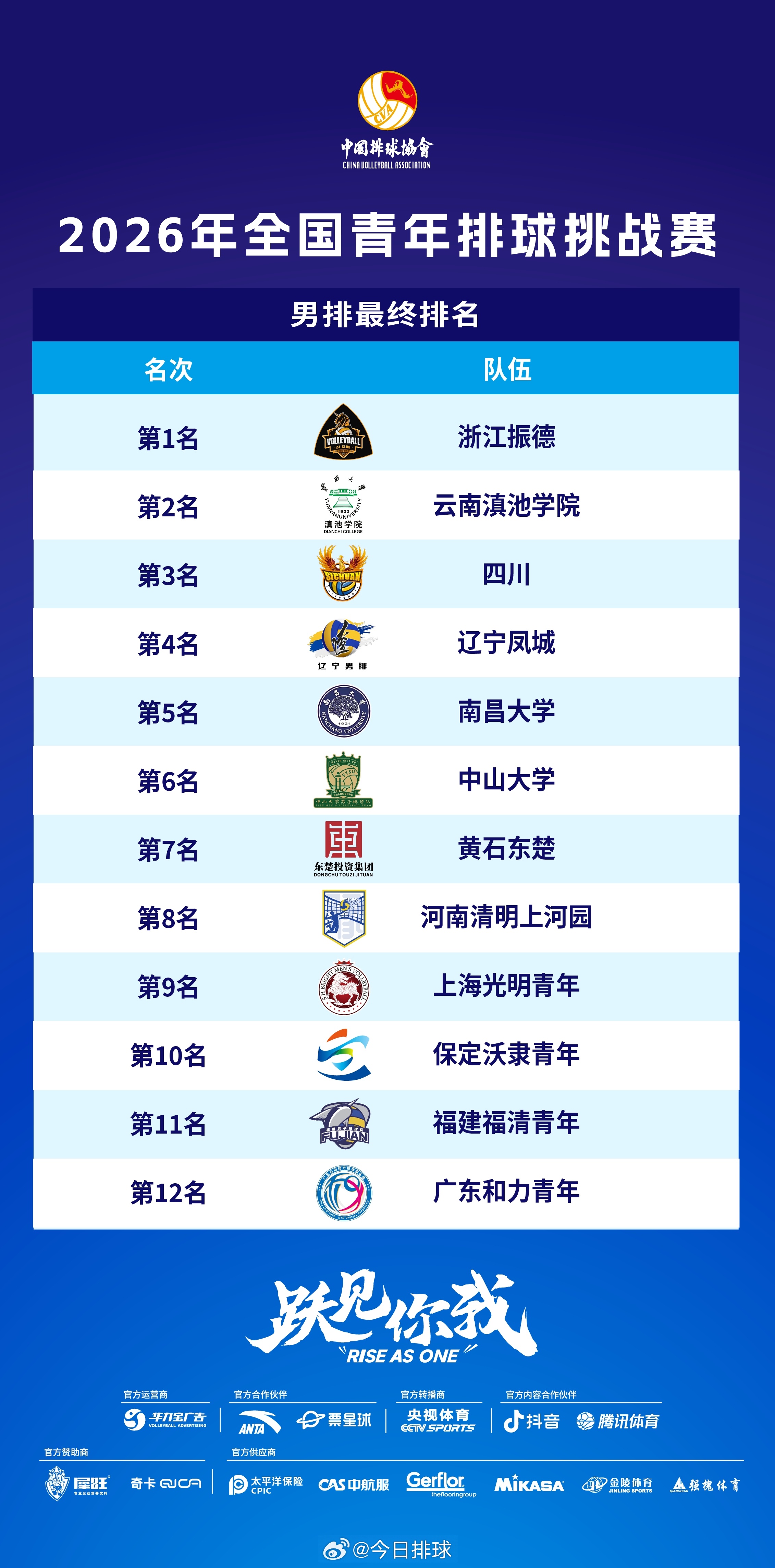2026年全国青年排球挑战赛 上周五结束,浙江振德和深圳澳洲虎中塞分别获得男女排冠军。待A级总决赛结束后,获得男女排第八名的球队,将分别与这两支球队进行单场定胜负的本赛季升级挑战赛,胜者保级或升入下赛季A级视为第八名,负者降级或仍为下赛季B级第一名。