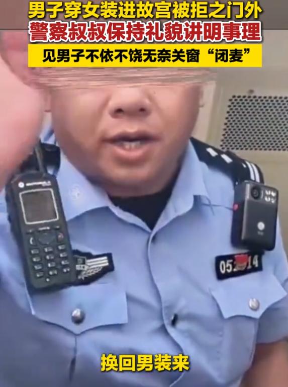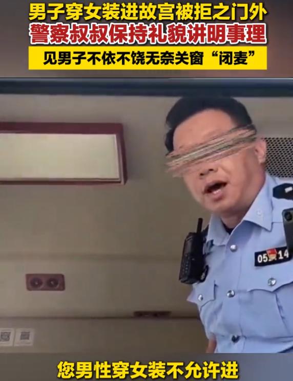 干的漂亮!北京,一男子男扮女装去逛故宫,结果刚走到大门口就被拦了下来,理由是男扮女装不让进,男子不服,就去找民警讨说法,本以为自己有理,结果民警也是站在故宫这一边的 视频中,能看出男子理直气壮,觉得自己花钱买了票,不让他进门就是不合理。帽子叔叔礼貌的解释:因为您男同志穿女装,这不符合故宫的规定 男子依旧不服气,说自己去其他景区,别人也没有说什么 帽子叔叔继续说:去其他景区我不管,但在故宫这,男性穿女装不允许进,这在官网都有规定,可以看一下故宫的官网,上面都有 如此解释完,男子依旧不罢休,还想要继续理论,最后无奈之下,帽子叔叔直接把警车的玻璃锁上 事后,男子把这个事发到网上,或许是觉得自己受到了不公平对待,但网友却一边倒的表示支持故宫做法 这事表面看是个穿衣自由和景区规定的冲突,但往深了想,其实是个场合和尊重的问题。故宫是什么地方?是全世界游客来北京必去的文化地标,是世界文化遗产,不是网红博流量的直播间,也不是什么人都能随便撒欢儿的主题乐园 有人可能要说了,穿什么是我的自由,凭什么管那么宽?这话对也不对 自由从来不是绝对的,得分场合。你去海边穿泳衣没人管你,但你穿泳衣进写字楼试试?你去漫展穿奇装异服那是融入氛围,但你在博物馆这么穿,旁边的大爷大妈、带着孩子的家长看着别扭不说,整个场景也不协调啊 故宫的规定其实挺清楚,也不是专门针对谁。人家要维护的是六百年的紫禁城该有的庄重感。你想啊,红墙黄瓦下,大家安安静静感受历史厚重感,结果前面一个男扮女装的大哥在扭捏作态拍照,这画面确实违和 更重要的是,万一开了这个口子,明天来个穿龙袍的,后天来个扮太监的,这地方还像什么样?工作人员每天啥也不用干了,光处理这些事儿就够呛 网友们这次出奇地团结,说明大家心里都有杆秤。不是不支持个性,也不是对男扮女装有偏见,而是在哪儿说哪儿的话,进庙拜佛还得衣着庄重呢,更何况是进故宫。这不叫古板,这叫懂事儿