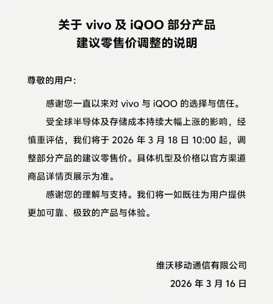 vivo宣布涨价vivo也宣布涨价,看来接下来手机都涨价是逃不过的。
