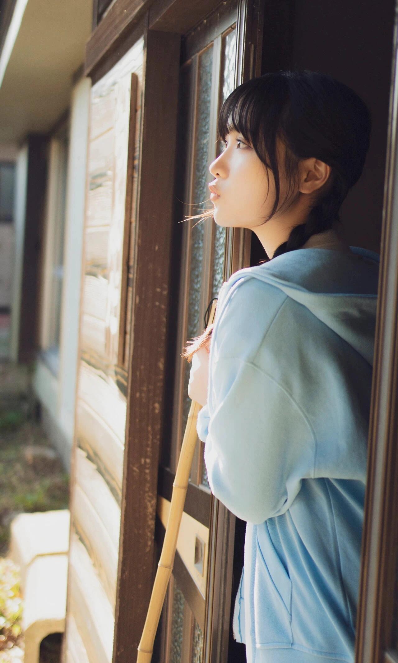 少女坐在木门前,清新自然,阳光洒进屋内,温馨舒适。甜美可爱