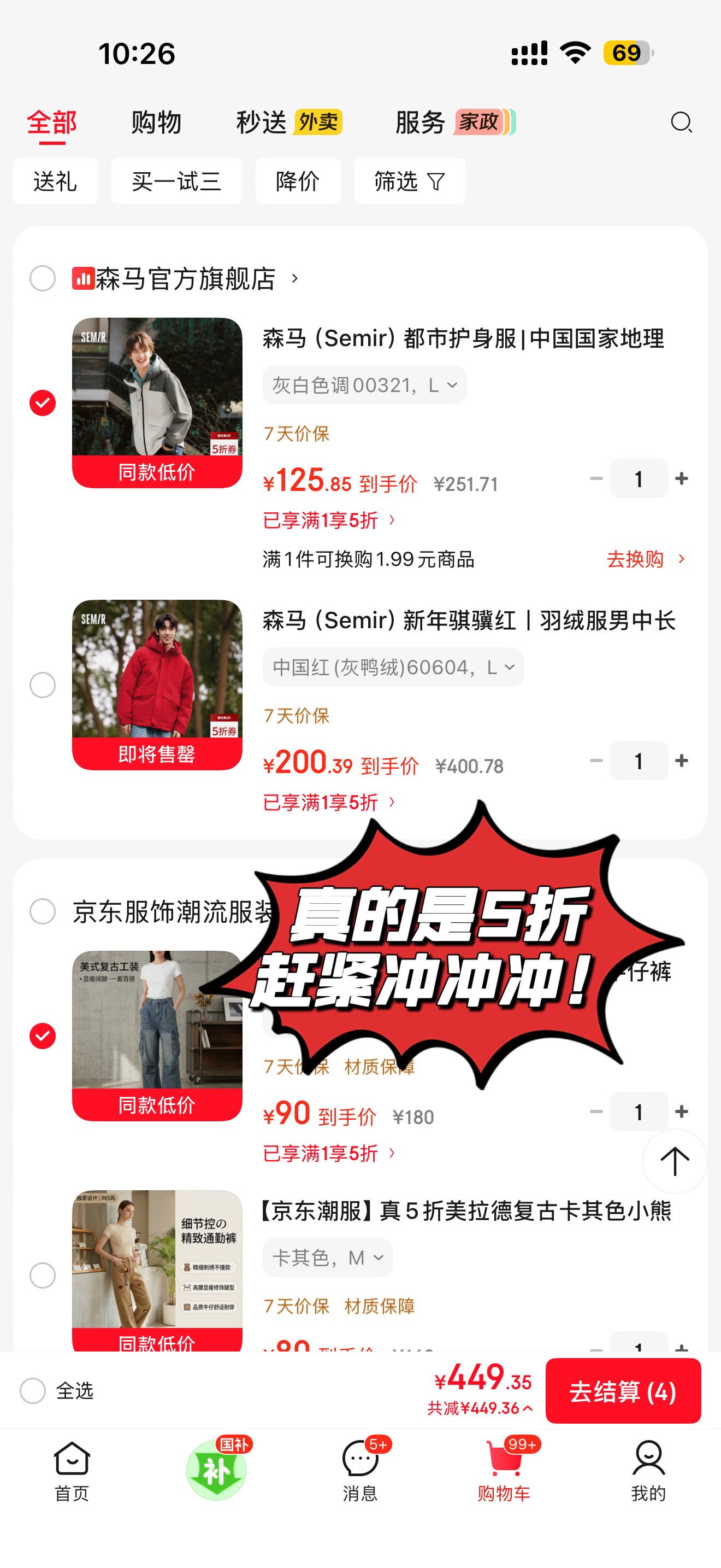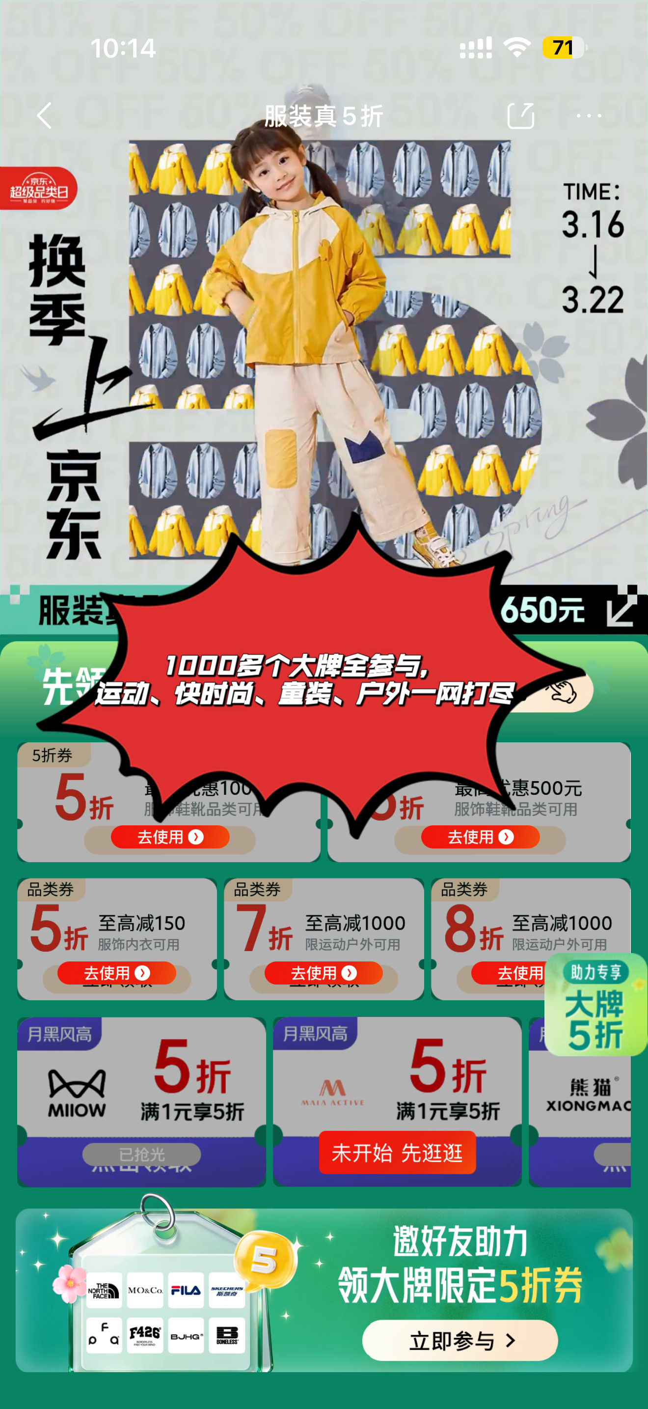 救命!!京东服装真5折又又又来了 这次是真把折扣摁在地上摩擦啊!戳【网页链接】3月16日0点-3月22日24点,整整7天,服装真5折回归,每人能领3张5折券,最高立减1650元,关键是不用凑单!不用满减!满1元也5折!我直接就是一个滑跪进场!春夏衣橱直接一键刷新,从卫衣衬衫到冲锋衣防晒衣,从勃肯鞋到工装裤,甚至连童装和运动户外都包圆了!更离谱的是——春季新款也打折?!这不比等换季清仓香一百倍???京东服装你是会劝的 换季上京东,服装真5折,我已经把券领好了,现在分享活动页面让好友助力,还能获得稀缺大牌的5折,FILA、斯凯奇、北面、edition、MO&Co、FPA、FDR、瞬时山野等都能拥有5折价,快来一起安排春装啦!