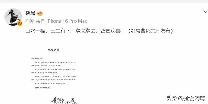 姚晨宣布离婚。46岁,已经离婚二次了。 第一段婚姻:2003年她与大学同学凌潇肃在毕业后登记结婚,这段婚姻持续了约8年,于2011年离婚。 第二段婚姻:2012年她与摄影师曹郁在新西兰举行婚礼,婚后育有一子一女,现在又离了。