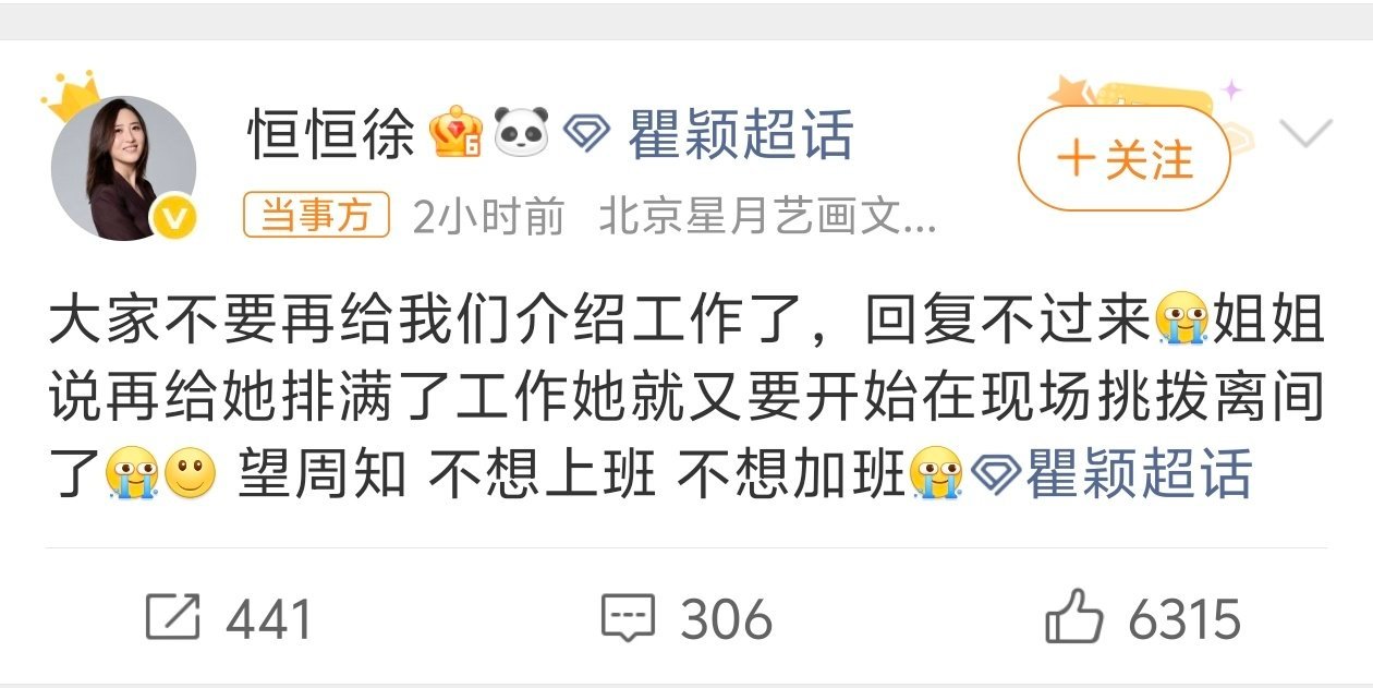 经纪人回应瞿颖翻红瞿颖经纪人发文让大家不要再介绍工作了,“姐姐说再给她排满了工作她就又要开始在现场挑拨离间了,望周知,不想上班,不想加班。”