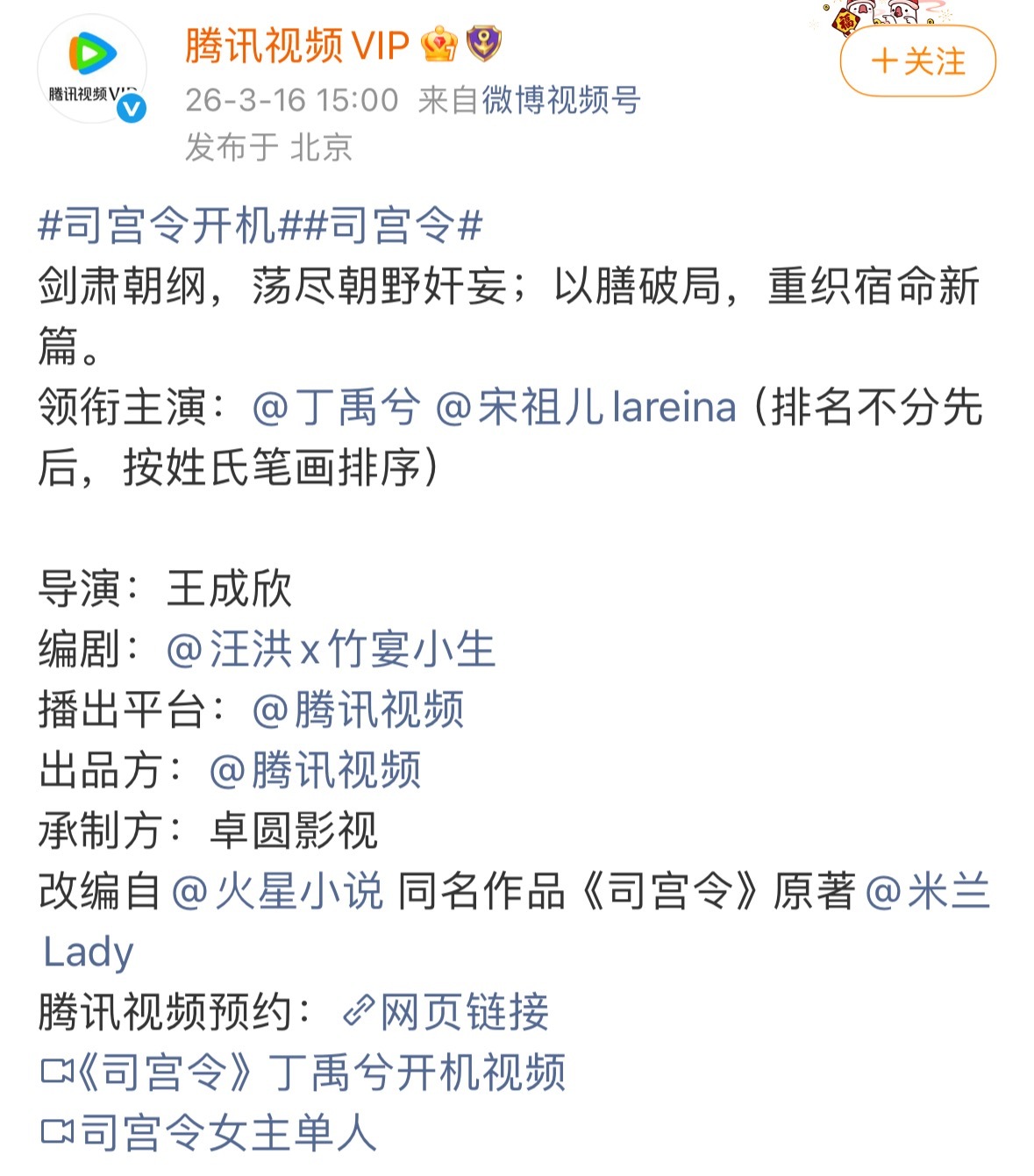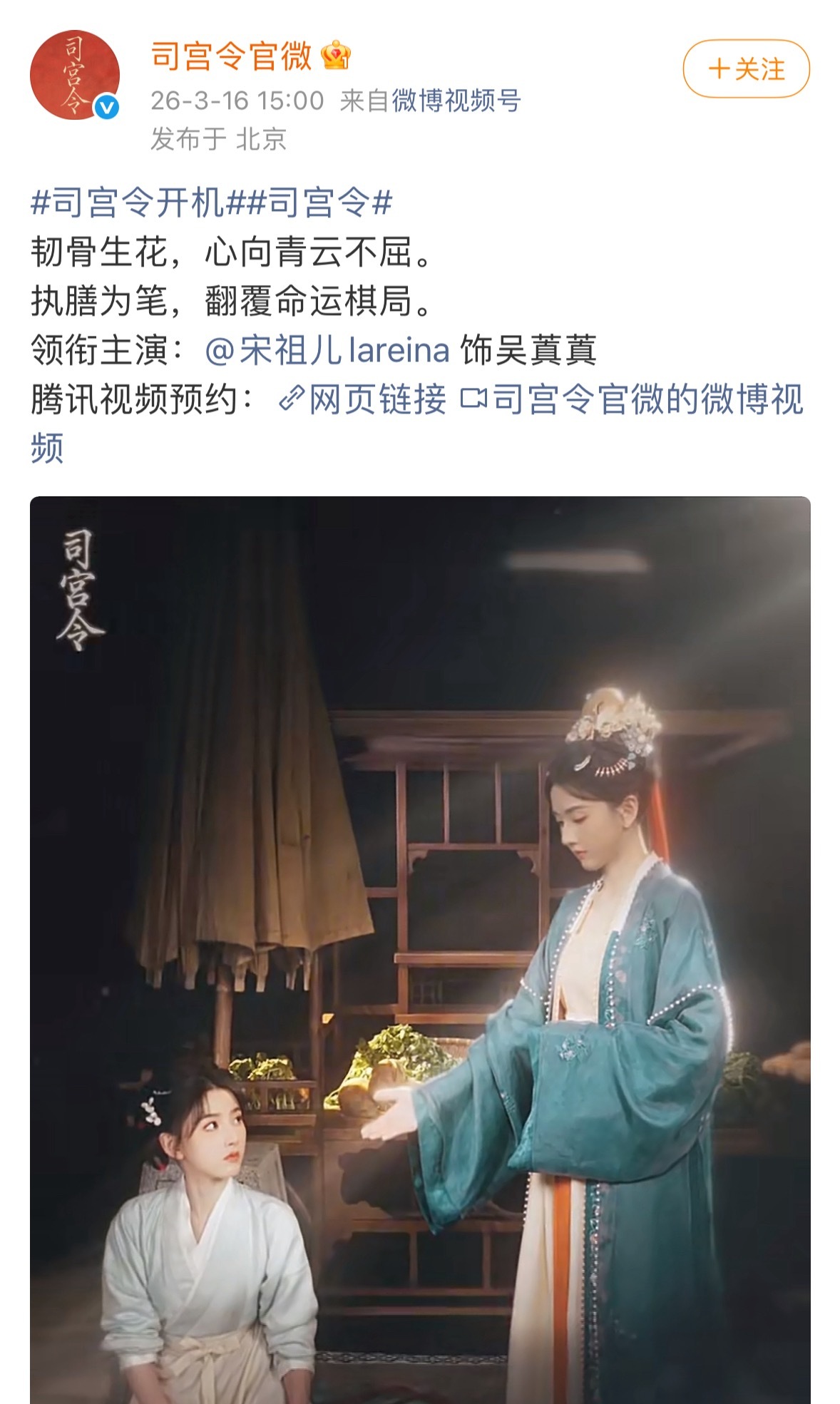 司宫令官宣了:丁禹兮 宋祖儿(排名不分先后,按姓氏笔画排序)