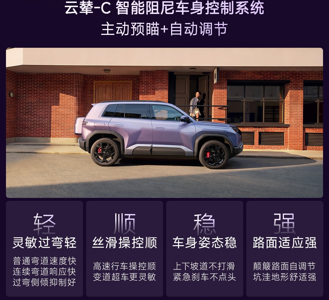 车本身其实也挺有意思。方程豹钛3虽然定位是A级车,但配置一点不小气。像云辇-C智能阻尼车身控制系统,简单理解就是悬挂会根据路况提前调整,过坑过坎不会那么颠,也算是黑科技打造豹力新体验。