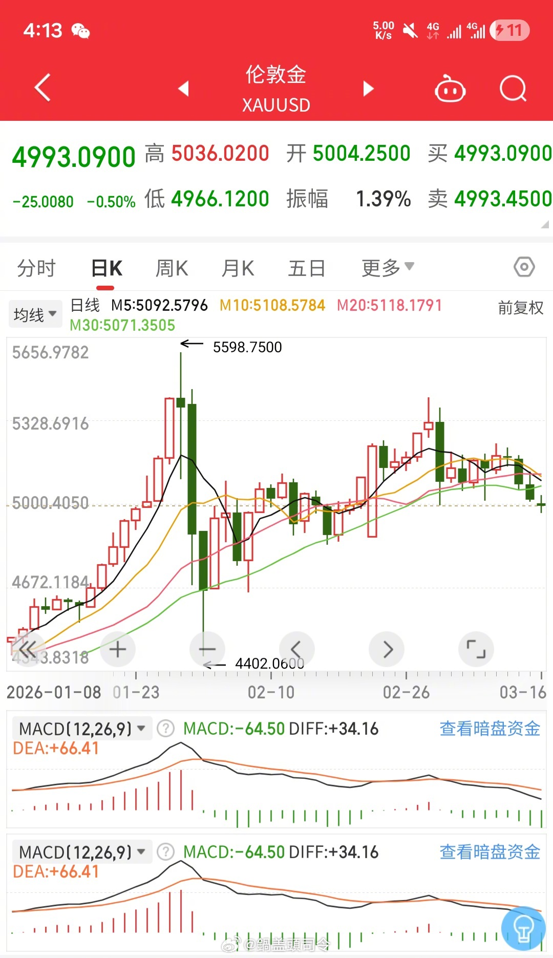 #金价#感觉差不多到头了吧?国际局势这样了,伊朗一直就没停下,结果黄金涨不动了。国际黄金还波动波动,能涨点跌点,国内金价近乎都是跌,涨也是夜盘涨,白天不涨哈哈哈。