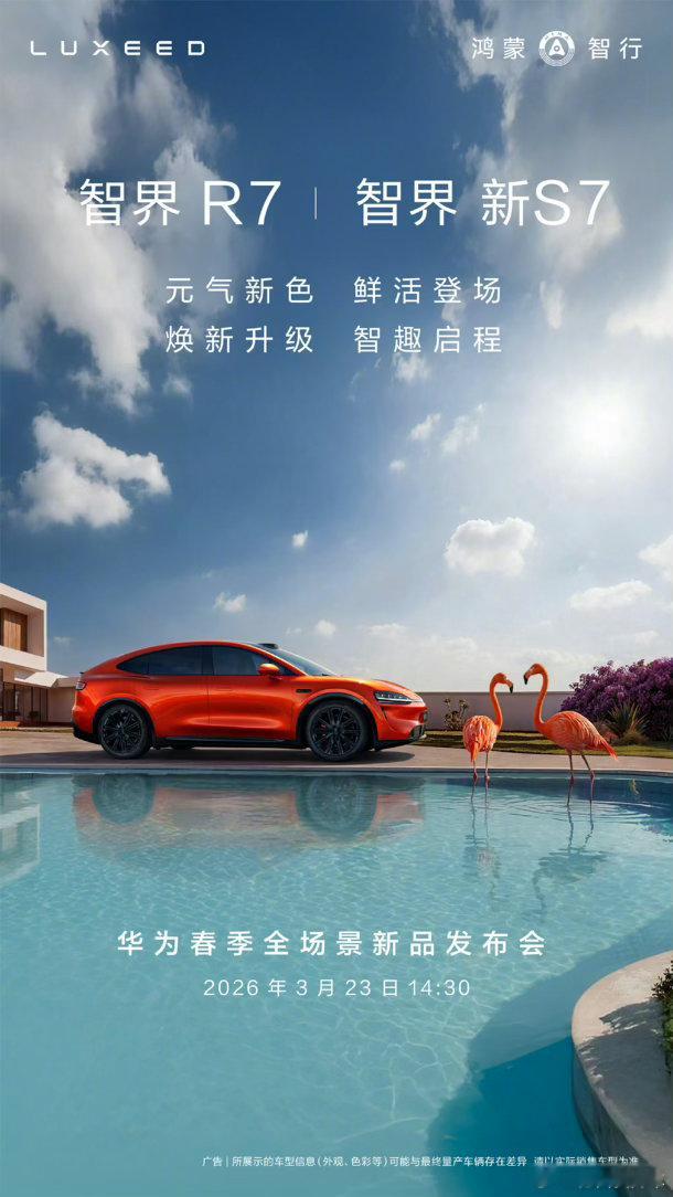 下周一华为春季发布会涉及鸿蒙智行七款车型:问界M8焕新加推新色,问界M7推出全新配色,问界M6首发开启预售,尚界Z7/Z7T首发预售,享界S9/S9T改款焕新,智界R7推出全新配色,智界S7预计改款焕新。华为发布会鸿蒙智行