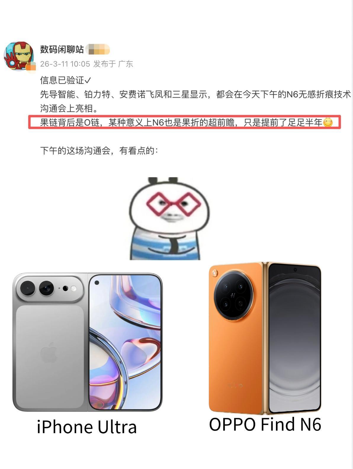 供应链做实?苹果折叠屏和OPPO居然是一样... 我一个同事一直很期待苹果折叠屏的,特别是期待那个视觉无折痕,网上说苹果折叠屏一来可能引爆折叠屏市场什么的,我同事已经持币以待。 - 但万万没想到苹果折叠屏憋了这么久,居然不是靠自己去搞定技术的,而是用我们国产供应链😂。。。 - 据说这条供应链还是OPPO Find N6同款,是OPPO联合先导智能、铂力特、安费诺飞凤和三星显示一起搞定的,OPPO Find N6先落地,苹果跟在后面。今天OPPO召开了技术沟通会,供应链厂商来站场了,OPPO这波真赢麻了! - Find N6除了折痕控制很牛外,据说影像和软件系统有大招,折叠唯一哈苏2亿超清四摄,AI手写笔让大屏使用效率更高,搭配超流畅ColorOS16,折叠系统体验估计也是第一梯队,还有满级防水、折叠首个内外 1nit 明眸护眼屏等等,各方面都很强。 - 按照目前的消息,苹果折叠屏用OPPO供应链这个事基本实锤了吧,想等9月的苹果,现在3月的OPPO其实更不错。 iPhoneUltra 折叠屏 数码科技 苹果折叠屏 数码科技 数码大玩家 一起聊数码 OPPOFindN6 FindN6无感折痕 OPPO