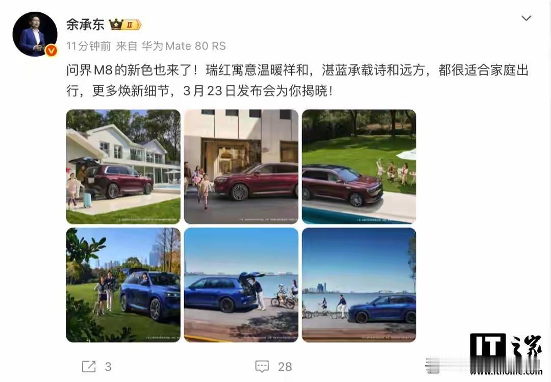 余承东刚官宣!问界M8新配色来了,感觉懂家庭的小心思全在这了。 这款车新的车色“瑞红”和“湛蓝”,光听名字就很有画面感 。两款都主打家庭出行,结合这车之前的口碑,我觉得这次配色不只是换个颜色,更是把家庭用车的细节琢磨透了。 先说说“瑞红”,不是那种艳俗的大红,是黑红交融的质感,透着低调奢华。家里老人喜欢这种喜庆又稳重的色调,孩子坐后排也不会觉得沉闷,日常接娃、周末走亲访友,开出去体面又温馨 。 再看“湛蓝”,灵感是“蓝调时刻”,车漆是5涂层珠光工艺,不同光线下会有动态光影变化。适合爱旅行的家庭,不管是去海边看蓝天,还是山间看晴空,这个颜色和自然风景特别搭。而且车漆工艺耐用,户外暴晒、酸雨侵蚀也不容易显旧,长期看很划算。 选配色其实和选车配置一样,都得看实用。问界M8本身空间就大,六座版二排是零重力座椅,三排也不挤,后备箱还能塞下露营装备 。新配色一上,不管是选瑞红还是湛蓝,都能让家庭车既有颜值又有实用性。 3月23日发布会还有更多细节,现在能确定的是,这两款配色精准踩中了家庭用户的需求。等实车到店,大家可以去看看,选个喜欢的颜色,让全家出行更有仪式感。