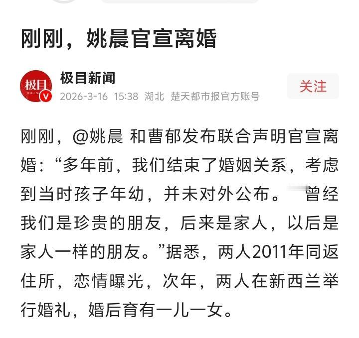 姚晨曹郁体面离婚背后:14年婚姻无声落幕,孩子成最大公约数,娱乐圈分手新范本引全网深思 当姚晨与曹郁那份冷静克制的联合声明出现在微博,许多人第一反应是错愕。没有狗血互撕,没有财产纠葛,甚至连分开的时间都模糊成“多年前”。这份过于体面的官宣,像一颗投入湖面的石子,涟漪之下,是公众对婚姻意义的一场集体审视。我们惊讶地发现,原来离婚可以不是一场战争,而是一次平静的告别。 声明中最动人的部分,是关于孩子的共识。他们选择隐瞒多年,只因“孩子年幼”。这短短四个字,是一个家庭最后的温柔防线。在舆论的放大镜下,保护孩子的寻常童年,成了父母最本能也最艰难的决定。这让我们想起,任何一段关系破裂的中心,往往都站着无辜的孩子,而成年人的体面,是他们能披上的第一件铠甲。 从昔日爱侣到“家人一样的朋友”,这种关系的转化,需要极大的智慧和克制。娱乐圈的分手戏码,我们见惯了歇斯底里和鸡毛满地,姚曹二人却提供了一种新可能:爱情会消散,但共同经历的时间与责任,可以沉淀为另一种更为恒久的情感联结。这何尝不是一种成熟?不辜负过去,也不绑架未来。 为何直到今日才公开?声明中未言明的,或许是给孩子一个稳定的成长过渡期,也或许是给彼此的事业与生活一个从容的缓冲带。成年人的世界,选择时机本身,就是一种负责。这与我们普通人面临重大变故时的权衡并无二致——何时告知父母,何时通知朋友,每一步都关乎对身边人的保护。 回看姚晨的两段婚姻,从与凌潇肃毕业即结婚的青春炽热,到与曹郁低调相守的十四年平稳,仿佛映照了许多人情感历程的缩影。我们都在爱情里学习,从懵懂到成熟,从执着于形式到懂得内容的珍贵。她的故事之所以引发共鸣,是因为那份“处理情感”的成长,每个人都感同身受。 网友的赞誉并非盲目。在这个动辄曝光隐私、利用私事炒作流量的时代,能主动选择低调、守护隐私、尤其守护幼子,这份克制本身就值得尊重。它传递了一个信号:明星的私生活,并非必须被兑换成热度的消费品。他们首先是人,是父母,然后才是公众人物。 当然,也有声音质疑,是否经济的高度独立,才赋予了这份“说散就散”的洒脱?这触及了一个更普遍的社会命题:当女性不再困于经济依附,当双方都能独自支撑生活,婚姻的纽带究竟是什么?是情感,是习惯,还是共同养育后代的责任?姚晨的案例,让无数在婚姻中权衡的普通人,看到了另一种答案的可能性。 这场平静的分手,最终让我们思考的,或许不是名人的聚散,而是我们自己对关系的定义。婚姻的成败,真的仅以时间长短论英雄吗?或许,一段关系真正的价值,在于它是否让彼此成长,以及在结束时,能否保留最初的善意与尊重。体面分手,不是爱情的失败,反而是对过往美好最郑重的致敬。 (来源:根据姚晨、曹郁官方联合声明及网络公开信息综合撰写) 娱乐圈婚姻 体面分手