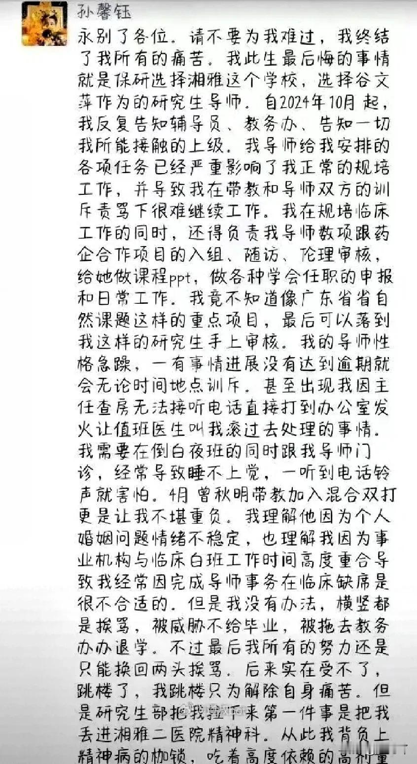 这下咱们可算是看清了,有些象牙塔里到底藏着多大特权。 3月14号深夜,湘雅那个保研的孙同学,带着千字绝笔跳进了江里。 信里写的内容真让人没法看。 好不容易考上顶尖医学院,居然成了导师的“全职保姆”。 跑腿打杂不说,在外地实习还能被连环电话吼回去伺候局。 “我觉得这根本不是在带学生,纯粹是明目张胆的权力碾压。” 这姑娘之前实在受不了,试图跳楼抗争过。 结果呢?换来的是被打发进精神科。 这得多绝望,才会觉得只有死才能挣脱出来。 现在人就这么没了。 按以往心照不宣的流程,涉事导师大概率也就是停招几年,拿笔钱把事平了。 普通家庭供出来的天之骄女,在绝对的权力面前,连及时止损的退路都没有。