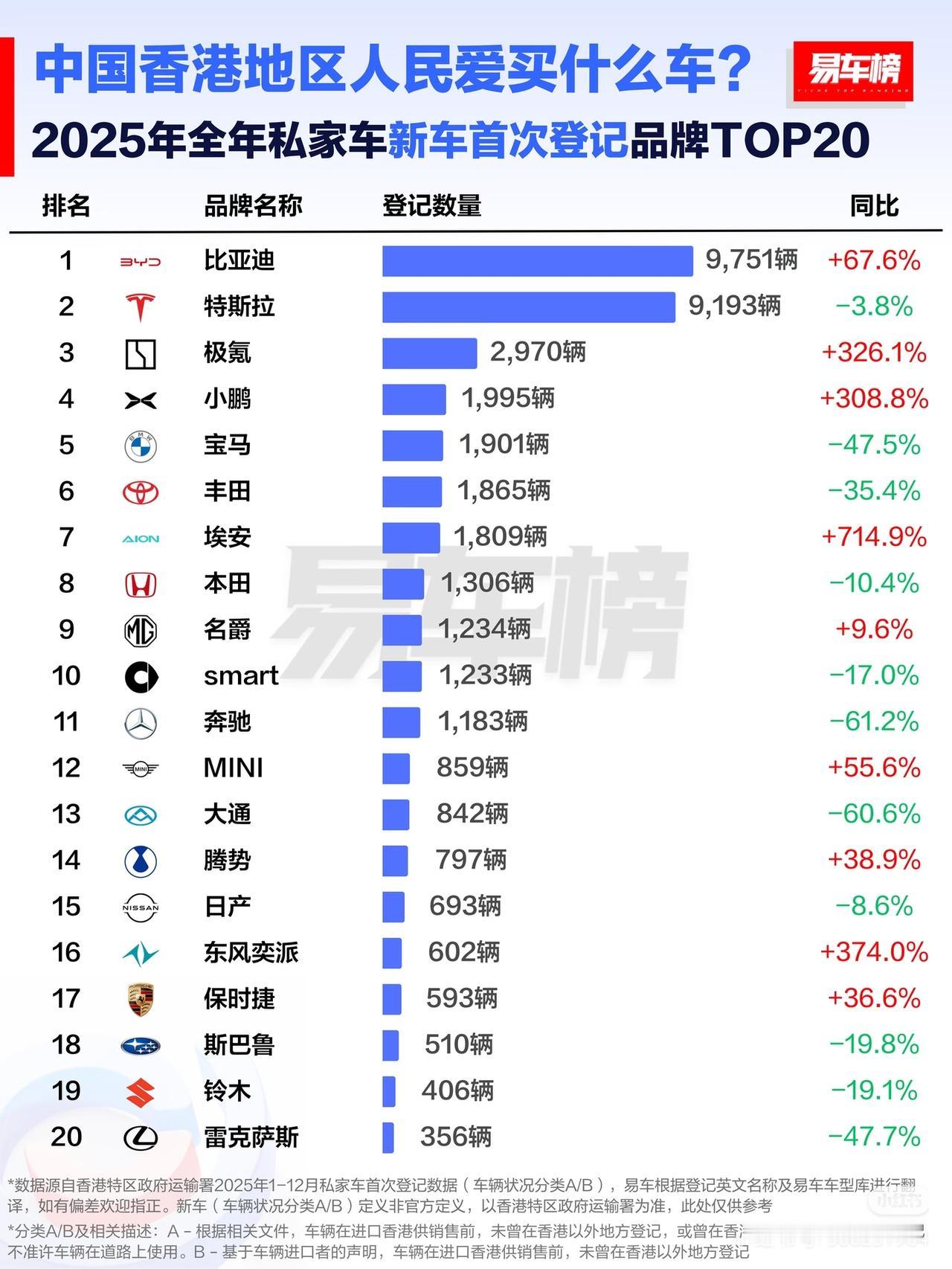 比亚迪登顶香港车市:一场“油电同价”的逆袭 2025年,香港街头跑得最多的车,第一次换成了中国品牌。 香港运输署最新数据显示,比亚迪以9751辆的全年销量,历史性超越特斯拉(9193辆),登顶香港全品牌销冠。这是中国汽车品牌首次在香港市场拿下“双料冠军”——不仅品牌销量第一,其车型海狮07 EV也以5680辆的成绩成为年度最畅销车型。 数据说话:从“陪跑”到“领跑” 这场逆袭并非一蹴而就。回顾2025年,比亚迪几乎是以“碾压”态势改写市场格局: • 1月开门红:首月注册量849辆,直接登顶单月榜首。 • 上半年定局:累计销量4902辆,超越特斯拉(3889辆),市占率高达26.71%。 • 全年霸榜:最终以9751辆的成绩锁定胜局,同比2024年劲增68%。 赢在“性价比”与“政策红利” 比亚迪的成功,精准踩中了香港市场的两大痛点:高油价与高税费。 1. “油电同价”降维打击:香港油价常年位居全球前列,燃油车使用成本极高。比亚迪通过“油电同价”策略,让消费者用燃油车的价格买到电车,直接击穿了传统日系车的“省油神话”。 2. 政策红利精准卡位:香港特区政府实施的“一换一”计划(首次登记税宽减),对车价设定了50万港元的上限。比亚迪主力车型恰好处于这一“免税黄金区间”,而特斯拉等外资品牌的高端车型则因超出限额而失去优势。 香港:中国品牌出海的“桥头堡” 香港市场的胜利,不仅意味着销量的增长,更标志着中国汽车品牌在高度国际化的右舵市场站稳了脚跟。随着“港车北上”政策的深入,比亚迪正通过香港这一“桥头堡”,凭硬核实力改写市场格局。