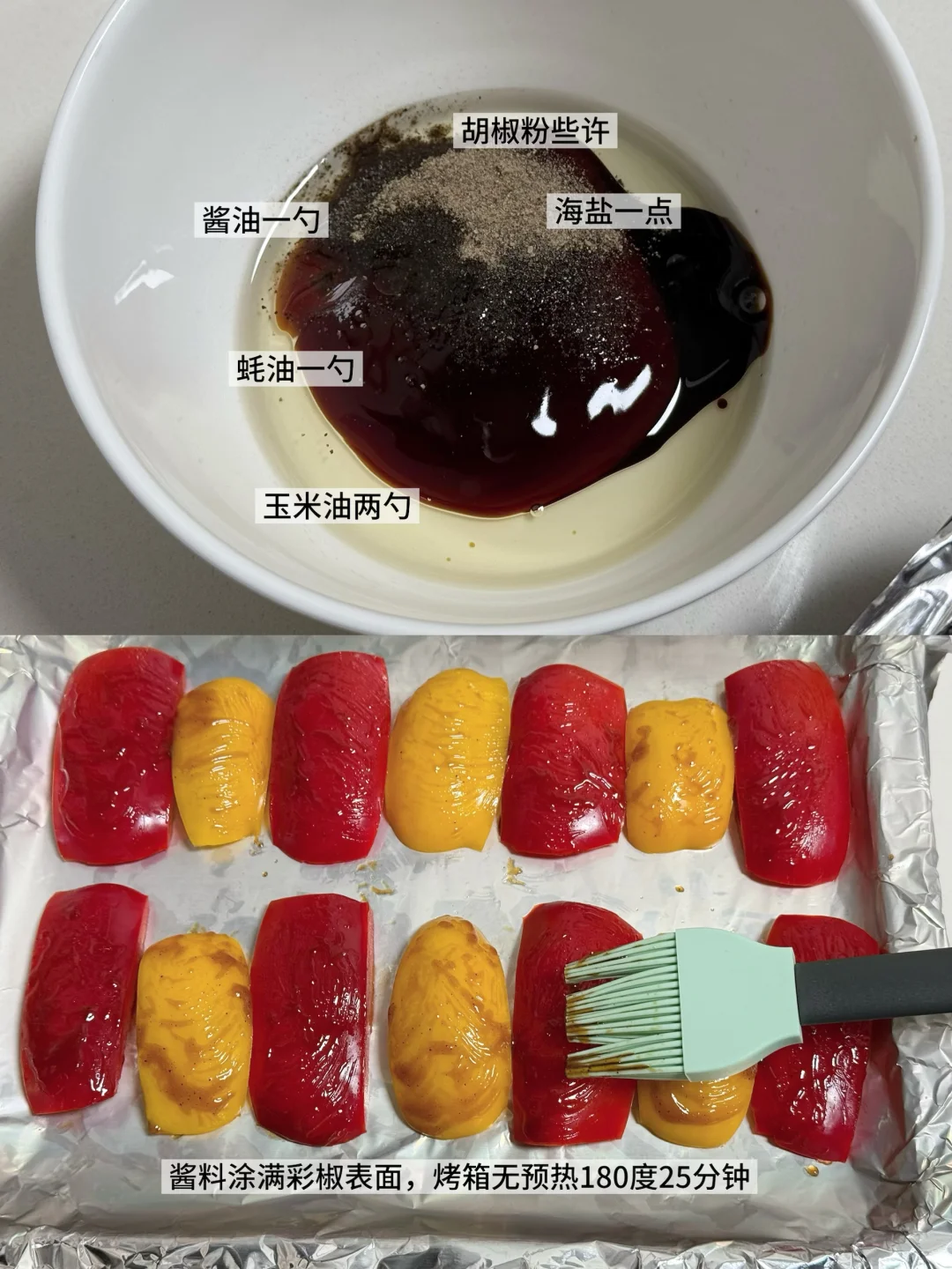 彩椒2整个、调料(玉米油2勺、蚝油1勺、酱油1勺、海盐些许、黑胡椒粉些许)