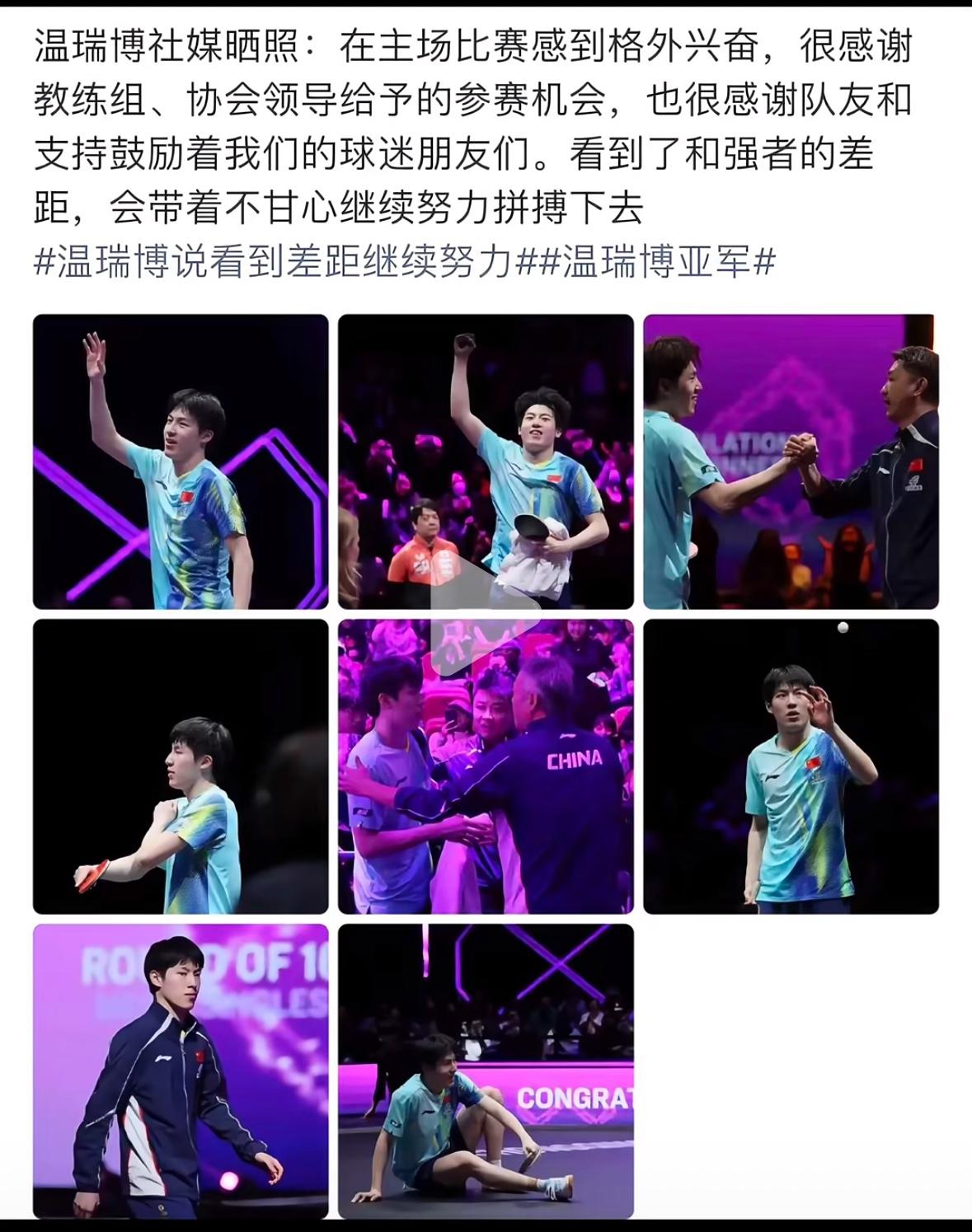 3月16日温瑞博感慨更新:看到了自己和强者的差距,会带着不甘心继续努力拼搏下去! 到达成都封训的温瑞博发出自己对 刚刚结束的重庆冠军赛自己夺得亚军后的感受: 在主场比赛格外兴奋, 感谢教练组给的参赛机会, 也感谢队友和支持鼓励我们的 球迷, 看到了和强者之间的差距, 会带着不甘心继续努力拼搏下去! 温瑞博1:4小勒布伦夺得重庆冠军赛的亚军,以外卡身份闯入决赛, 而且也是一路披荆斩棘的击败 科顿,莫雷加德,邱党, 张本智和,这个亚军含金量很高, 温瑞博竟然在发文下面的相片 里没有展现自己的亚军相片, 我觉得这个亚军很了不起, 加油温瑞博,世界杯见, 封闭训练加油!