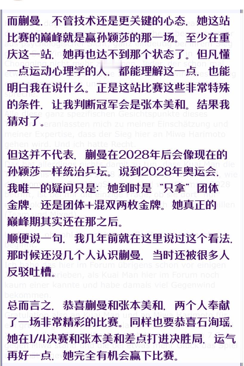 德国球迷关于重庆冠军赛温瑞博与蒯曼夺得亚军的一些看法! 3月15日,2026重庆冠军赛轰轰烈烈的结束了, 蒯曼苦战7局3:4张本美和夺得亚军, 温瑞博1:4不敌小勒布伦夺得亚军! 德国球迷的看法有些不同, 他们认为张本美和在这站的运气 非常好,首先是长崎美柚的退赛, 王曼昱,和孙颖莎的先后出局, 蒯曼的最佳状态留在打莎莎时, 张本美和才能夺冠🏆! 德国球迷对温瑞博的评价非常高, 他们认为温瑞博最近一段时间 把世界顶级选手打一个遍, 莫雷加德,邱党,达科, 杜达,弗朗西斯卡,雨果…… 温瑞博有杀生的优势, 重点还是能不能扛住外协的研究, 毕竟他才参加成人赛, 别人对他并不了解, 而且温瑞博的打法体系有点乱, 别人猜不透, 这也是他的优点! 加油温瑞博,未来可期!