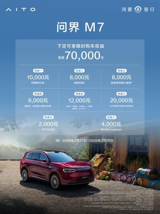 以前一到春天就想自驾去远一点的地方玩,但总担心来回路程长、人又累。换上问界M7之后,这个顾虑基本被治好了。增程长续航版CLTC满油满电综合续航1690km,直接规划跨城路线,中途随缘找个服务区休息就行。途灵底盘+双腔空气悬架配连续可变阻尼,国道、高速、乡间路一路切换,车身都很稳,过弯还有Pre-Curve弯道预瞄,坐在车里就是“晕车缓解区”。最近问界M7还官宣了夜紫新色,高质感车漆配上流动光影,真的把SUV的时尚格调拉满,春天开出去肯定特别出片。HUAWEI iDVP数字平台加持,整车101个控制器都能OTA,开着开着车就更聪明了。现在这个时间点入手也刚好:2月27日-3月22日下定问界M7,可享限时至高70000元购车权益,像1万元购置税补贴、价值6000元星际蓝/牧野青外观限时免费、20000元ADS高阶功能包补贴、4000元辅助驾驶无忧服务等都能拿到,春季长途自驾直接一步到位。