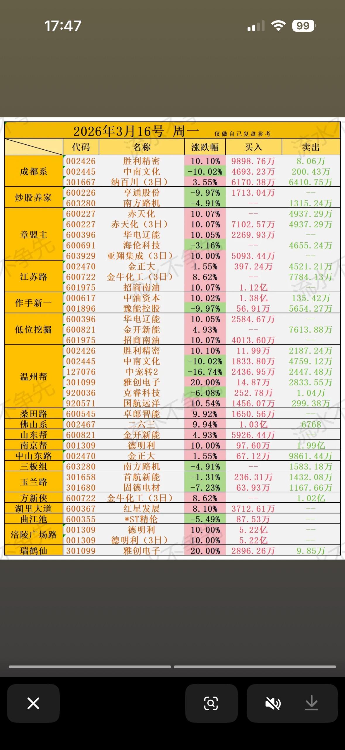 3月16日游资龙虎榜个股揭晓 3月16日游资龙虎榜太有看头了!当天共55只个股上榜,游资阵营多空对决超激烈。作手新一豪掷6.4亿扫货中油资本,坚定看好大金融+国企改革赛道,同时在豫能控股上净卖出,对算力电力板块态度有分歧。章盟主操作更是攻守分明,主买华电辽能、亚翔集成,却大手笔卖出红宝丽、金正大。徐留胜瞄准半导体赛道,净买入朗科科技。 另外,法尔胜因日振幅值达到15%登上龙虎榜,近5个交易日内第4次上榜。赵老哥等知名游资也在其列。这一天的龙虎榜真是揭秘了不少大牛股的游资动向,值得好好研究!