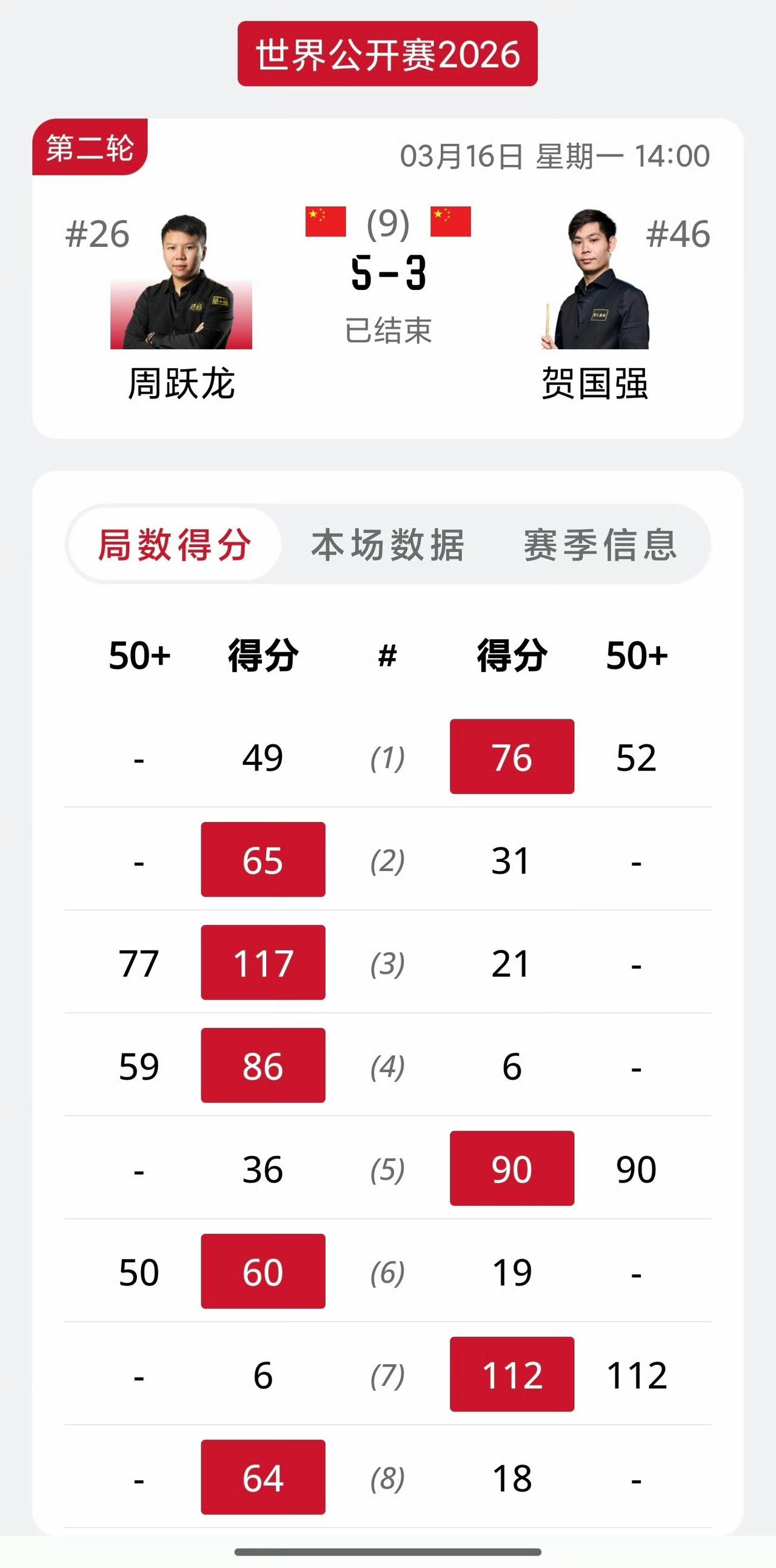 2026斯诺克玉山公开赛64进32轮次,墨菲展现大心脏,1-4落后,连胜4局上演超级大逆转。周跃龙赢下中国德比晋级32强。 墨菲5-4大卫利利 周跃龙5-3国强