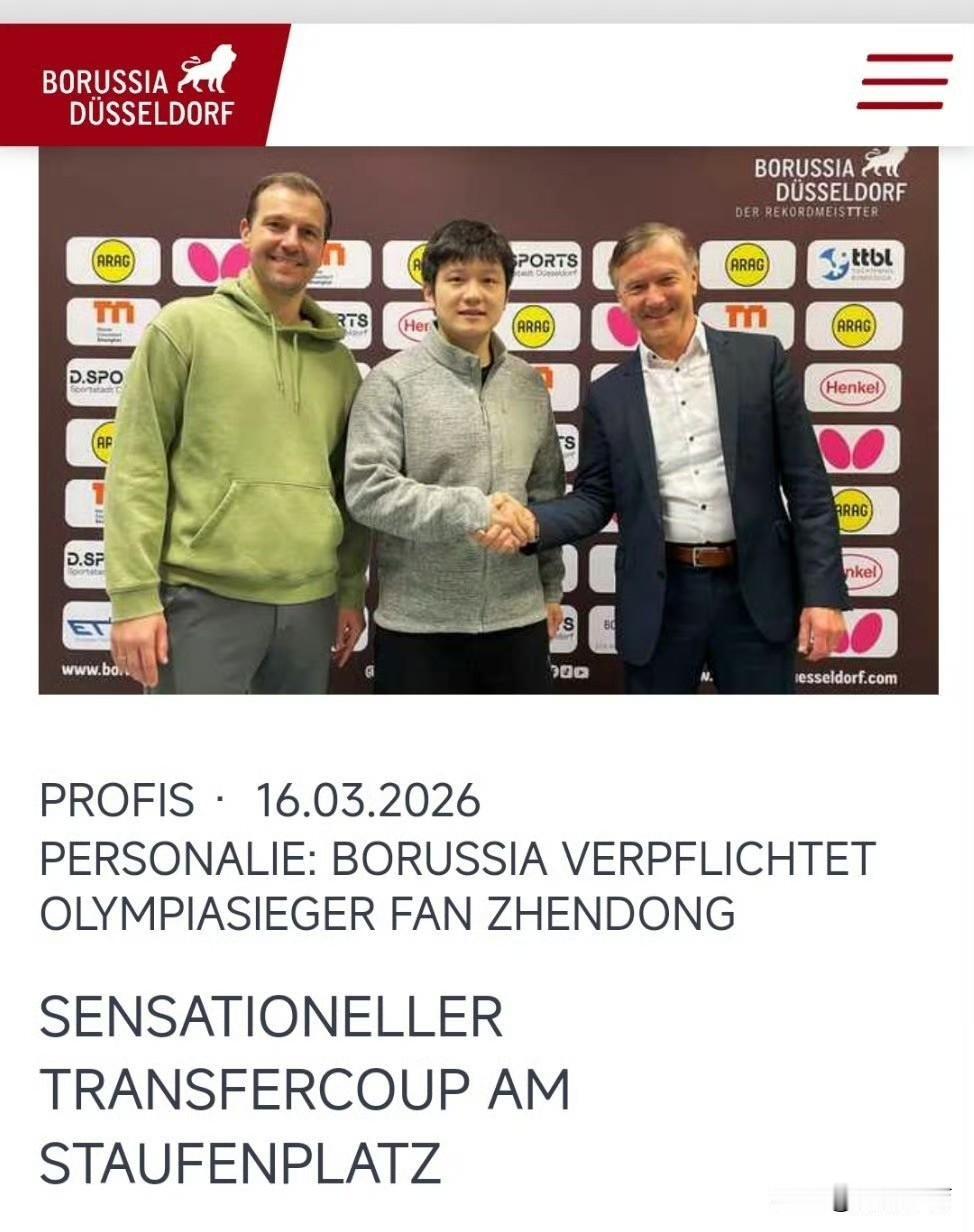 樊振东官宣转会杜塞尔多夫 官方消息,樊振东正式加盟德甲杜塞尔多夫俱乐部,签约2026/2027赛季一年合同,将于7月1日从萨尔布吕肯转会。他与波尔情谊深厚,新赛季将与邱党、卡尔伯格、卡纳克等名将组成豪华阵容,继续征战欧洲赛场,开启全新征程。