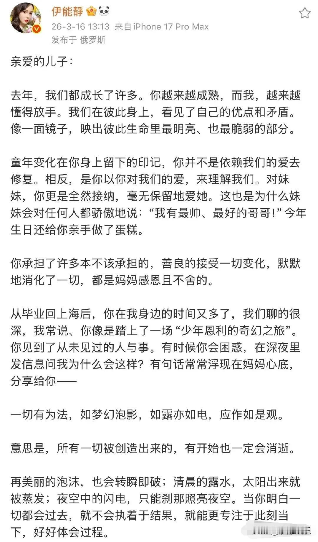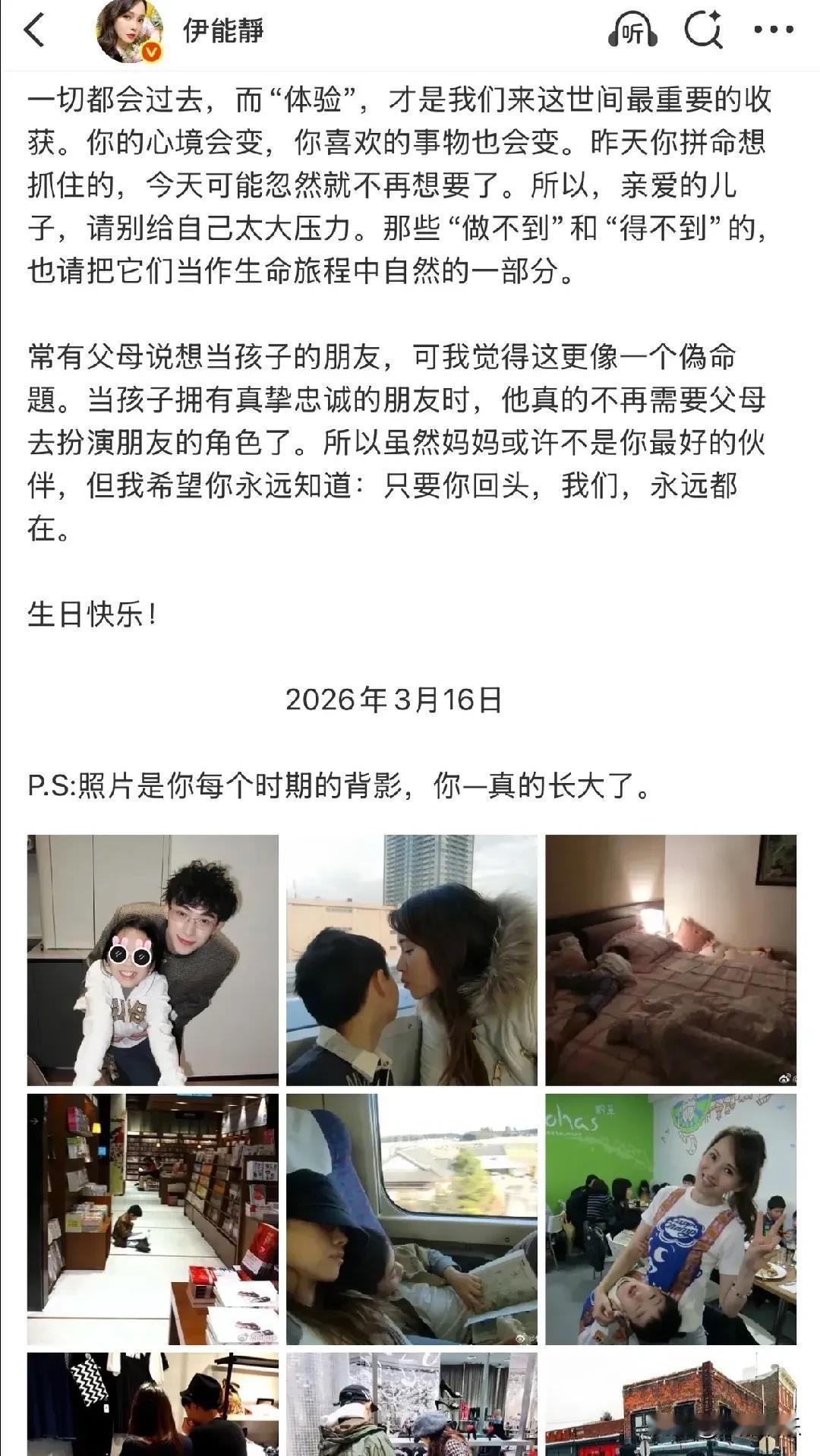 伊能静,激动发文! 3月16日中午,伊能静在社交平台投下一枚“情感炸弹”——儿子恩利24岁生日这天,她发了一篇千字长文,直接把无数父母看破防了 。 有人说,伊能静是被演艺事业耽误的作家。这话真不假。她没有堆砌华丽的辞藻,却用最朴素的镜头语言,晒出了儿子从襁褓中的婴儿到如今搂着妈妈逛街的少年的背影变化 。那一张张照片,简直就是一部“母亲目送”的纪录片。 伊能静在信中提到一个细节特别戳人:她把儿子回国后的生活形容为 “少年恩利的奇幻之旅” 。面对儿子深夜发来的关于人情世故的困惑,这位星妈没有喋喋不休地说教,而是甩出了一句佛家偈语:“一切有为法,如梦幻泡影,如露亦如电,应作如是观。” 好家伙,这哪是母子聊天,这简直是哲学沙龙!她告诉儿子:别执着结果,享受过程。这种通透,在娱乐圈妈妈里绝对是一股清流。 现在的恩利,确实值得骄傲。从纽大导演系提前毕业后回上海发展,不仅搞音乐、上杂志,还拿奖拿到手软 。但最让伊能静暖心的,恐怕不是儿子的那些荣誉,而是恩利对妹妹米粒那种毫无保留的宠爱。米粒会骄傲地跟全世界炫耀“我有最帅最好的哥哥”,今年生日还亲手给哥哥做了蛋糕 。看着兄妹俩互动的画面,谁能想到这是同母异父的组合?感情好得让亲妈都嫉妒不起来。 说到恩利,不得不服他的高情商。在这个拥有八口人的重组大家庭里(亲爸庾澄庆、亲妈伊能静、继父秦昊、继母张嘉欣,外加各路弟弟妹妹),这孩子硬是把关系处成了教科书级别 。 他管继父秦昊叫“爸”,管亲爸叫“庾爸爸”。虽然这让亲爹庾澄庆偶尔“吃醋”破防,但这恰恰说明恩利懂得用不同的方式去爱每一个家人 。伊能静更是清醒,当年儿子怕给继母张嘉欣送礼物她不开心,她直接回了一句:“多一个人爱你,妈妈高兴还来不及。” 格局打开,说的就是这种。 说实话,看多了那种“我为你牺牲了一切”的苦情式父母,再看伊能静这种“母子同是行者”的豁达,简直像喝了一杯冰美式——提神醒脑 。 很多家长总把孩子当附属品,恨不得拴在裤腰带上过一辈子。但伊能静告诉我们,真正的母爱,不是恒久的占有,而是一场得体的退出 。当24岁的恩利拉着她的手在雪地里散步,从被保护者变成保护者时,我们看到的是两个独立灵魂的彼此成就 。 就像网友说的:“最好的母子关系,就是逐渐放手,彼此成就最好的自己。”