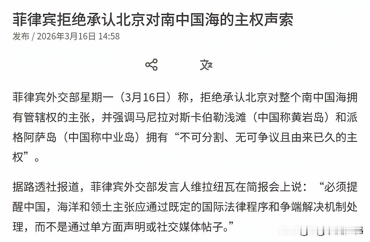 最近菲律宾在南海又整幺蛾子了,这就是给老美当枪使!3月16号它们直接放话,说啥不承认中国对南海的管辖权,还嘴硬黄岩岛、中业岛是它们的,甚至敢放狠话让中国听国际仲裁的话,纯纯给脸不要脸!咱先掰扯掰扯历史,黄岩岛咱元朝1279年就发现了,1935年正式划进中国版图,地理位置还在东经117°51′,早就在菲律宾西边国界118°以外了,它们之前还多次承认是中国领土,现在翻脸比翻书还快!中业岛更不用说,名字都是咱中国军舰起的。1971年咱台湾军队避台风撤了,它们赶紧趁虚而入占了55年,还在上面修机场建堡垒,把这当侵略南沙的老窝,纯纯小偷行为!再说那啥南海仲裁案,就是菲律宾抱着美国大腿搞的鬼,咱们早就摆明态度“不接受、不参与、不承认”,这破裁决本来就不公平,现在菲律宾还拿这说事,纯纯拿无知当个性!说白了,菲律宾就是给老美当枪使,想在南海挑事恶心中国,还想蹭点好处,但咱中国领土半寸不能让!