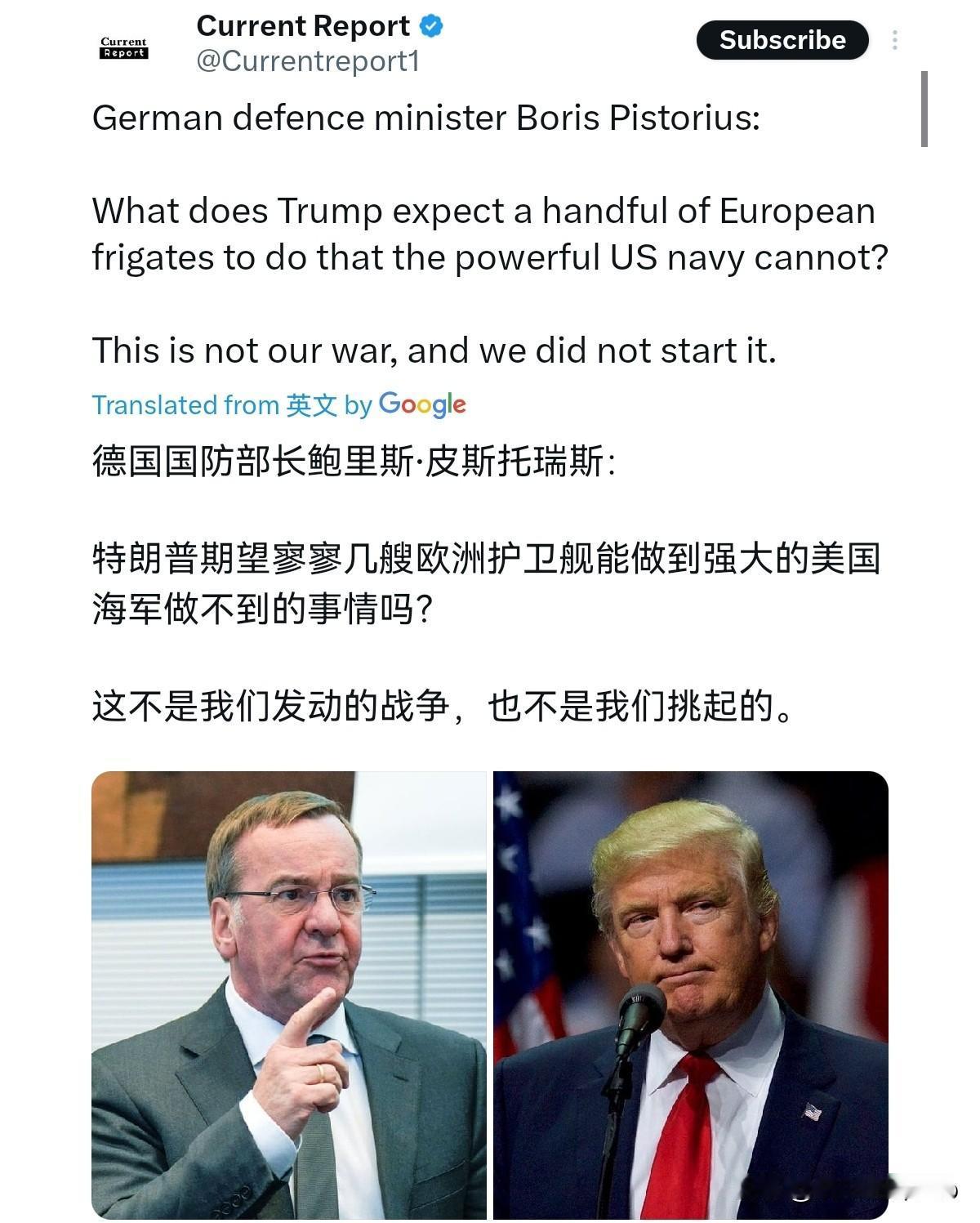 德国不仅不护航,而且还对美国泼了一盆冷水!在德国明确表示不会参加任何护航行动之后,德国国防部长再次出来表明态度!3月16日,德国国防部长鲍里斯·皮斯托瑞斯表示,特朗普希望少数几艘欧洲护卫舰能做什么强大的美国海军做不到的事情?这不是我们的战争,也不是我们挑起的。 很显然,德国国防部长的一番话,这对于美国无疑是泼了一盆冷水。德国防长的意思很清楚,当下局势,跟德国毫无关系。这不是德国挑起的,也不应该由德国出力去解决。而且,德国不仅不会帮美国的忙,更认为美国自己也解决不了问题。所谓的护航,在德国看来,本质上是美国迫不得已想出来的馊主意。 这番公开的“拆台”,不客气的说,这标志着欧洲对美国的战略捆绑正在彻底松绑。德国如此决绝,这反过来也证明,美国在盟友眼中已经非常不得人心。当然,就美国对待欧洲的态度,美国完全是咎由自取。当初美国对欧洲加关税,在格陵兰岛问题上对欧洲妄图强取豪夺,这又岂是盟友所为呢?现在美国反过来有求于人了,一句好话都没有,欧洲凭什么给美国好脸色呢?这种窘境,当然只能怪美国自己把事情做的太绝了。