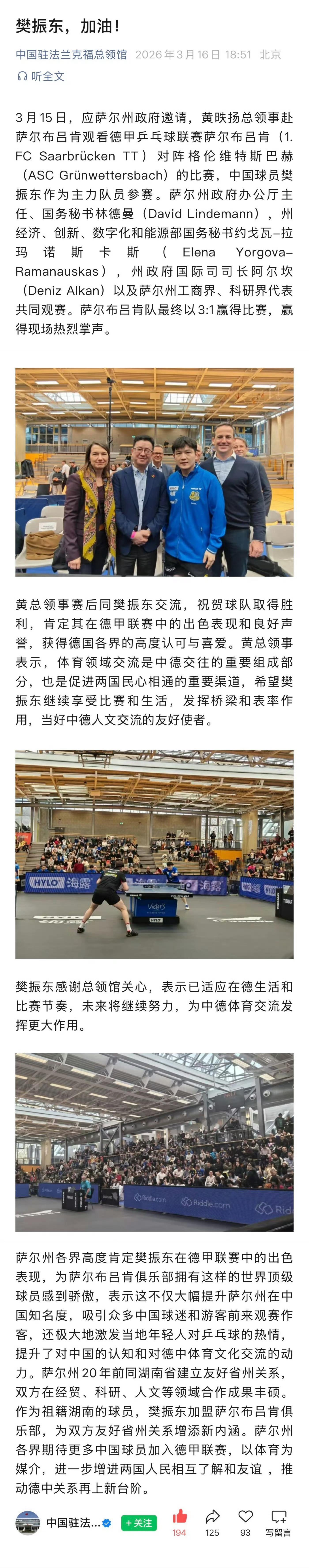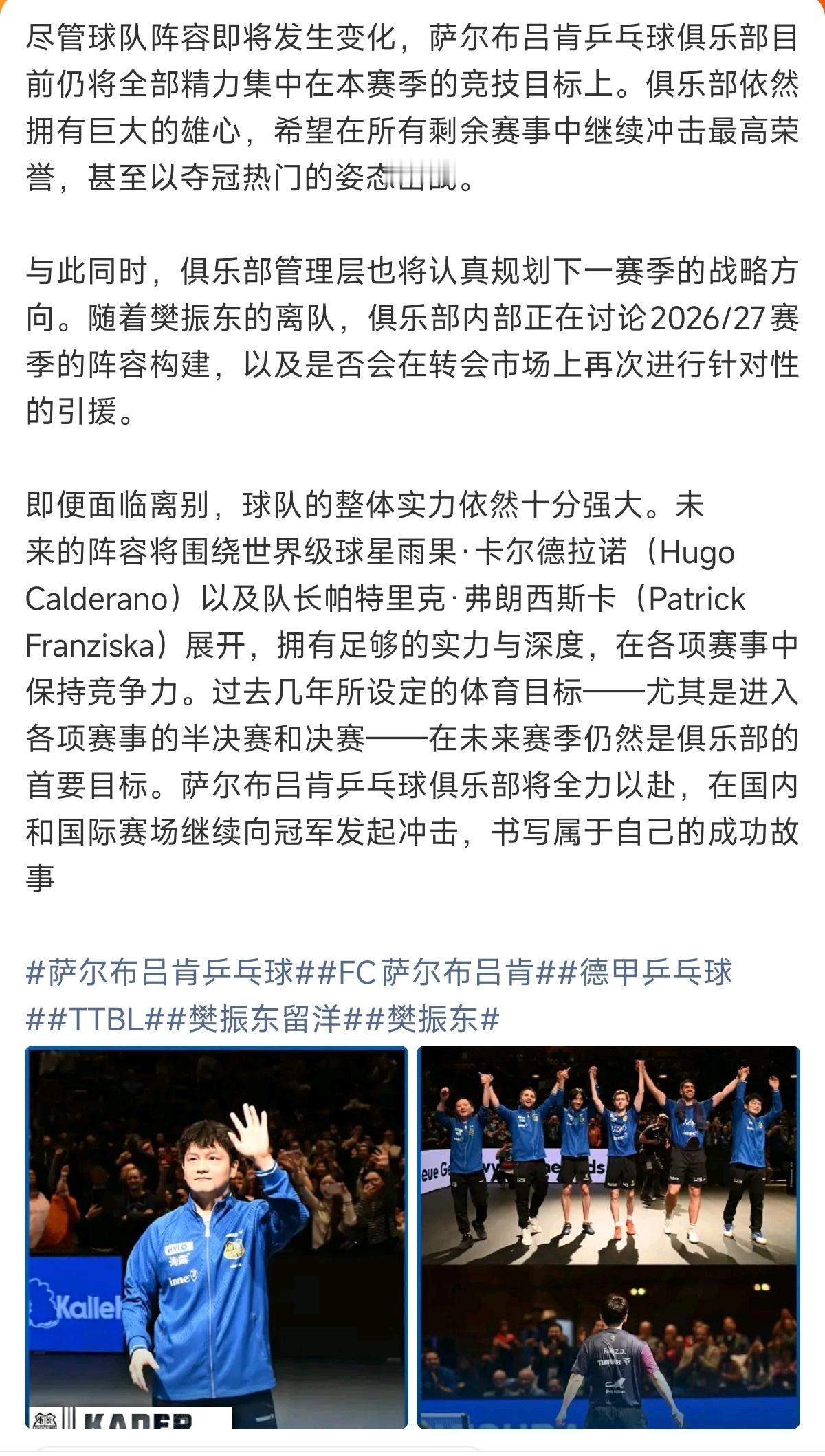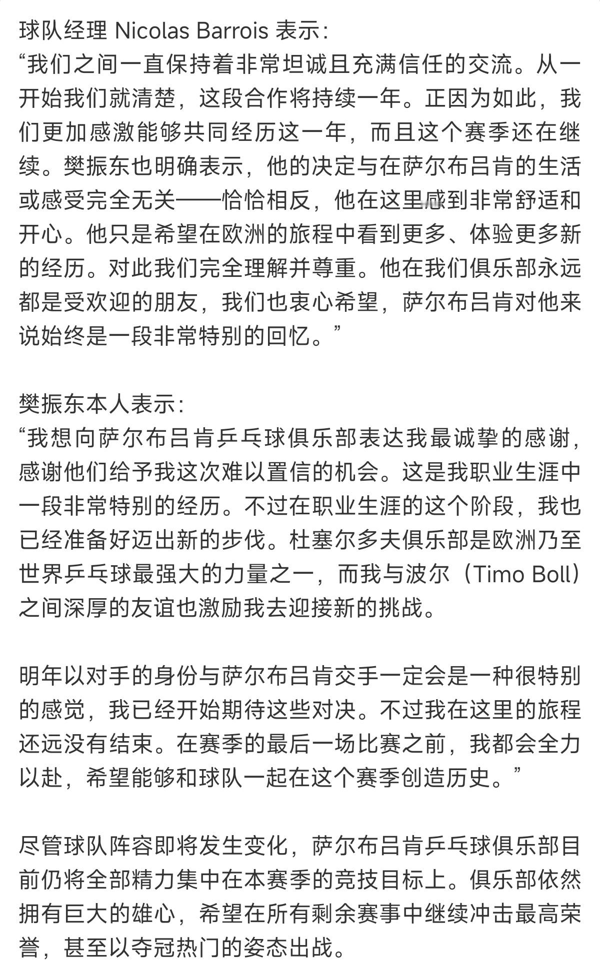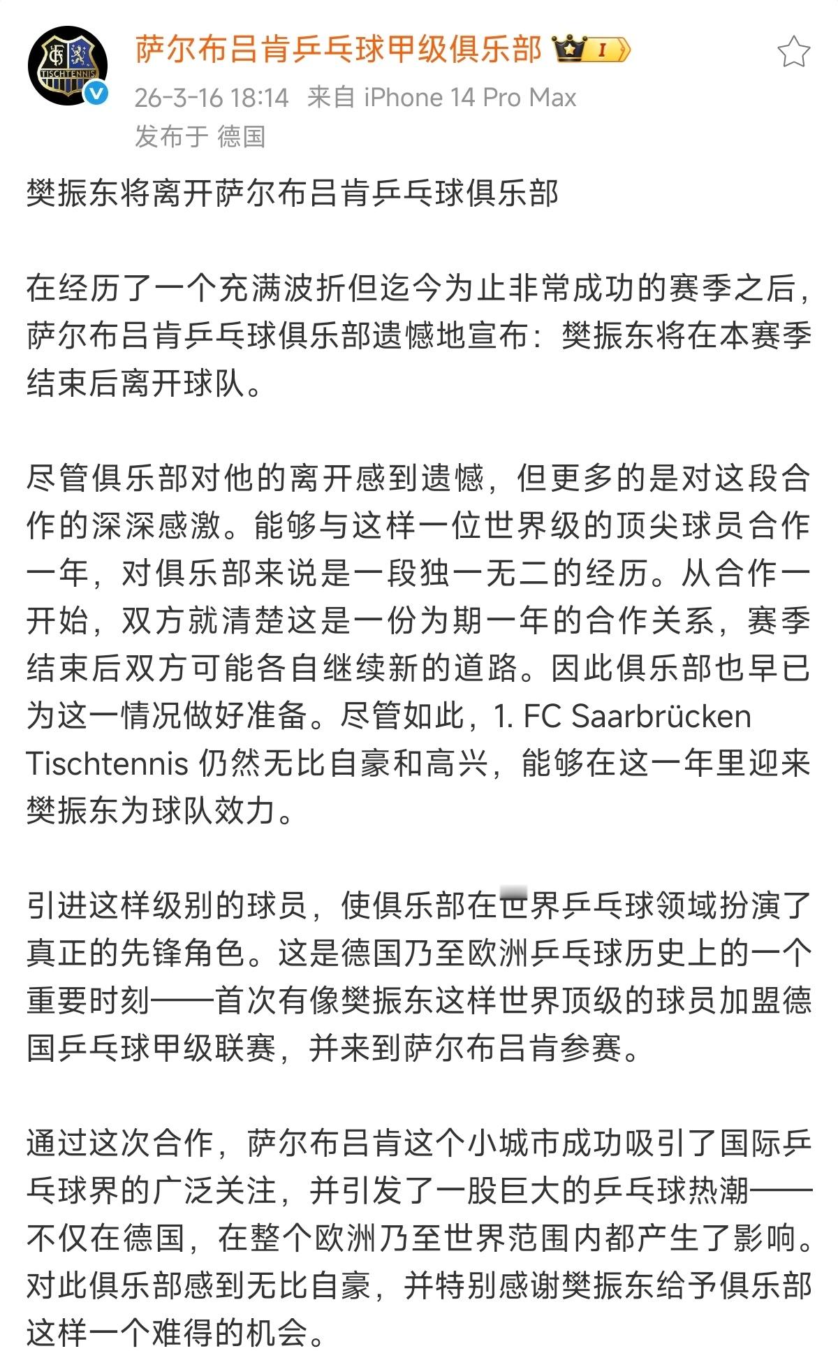 樊振东将离开萨尔队樊振东的到来这已经不是双赢的局面了,而是双赢、多赢、共赢、全赢的场面了!来时欢迎,走时欢送。感谢萨尔布吕肯俱乐部的真诚之心!杜塞尔多夫回应樊振东加盟
