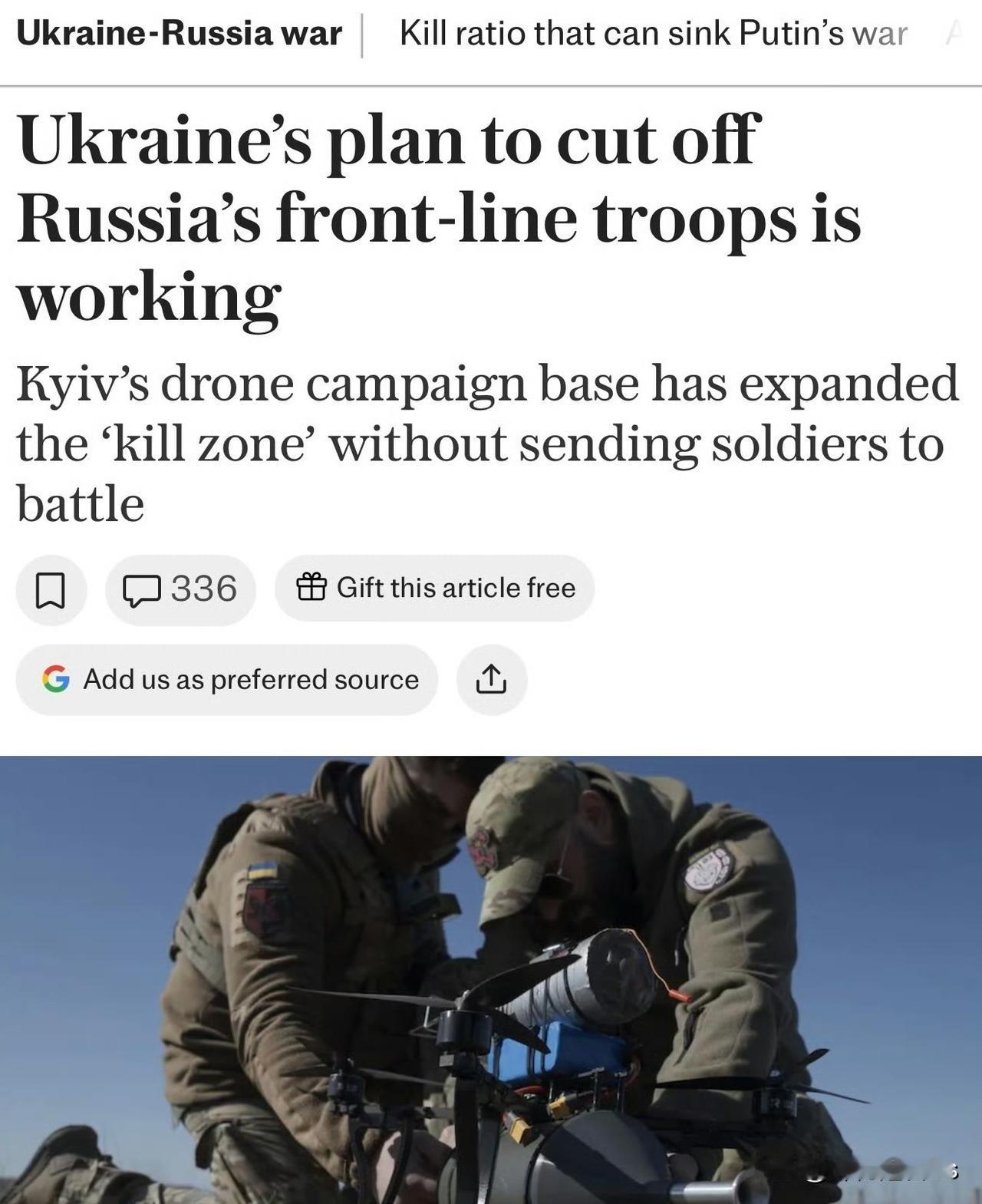 乌克兰利用无人机扩大战场而无需增派士兵 据 Telegraph 报导,乌克兰正透过 大规模无人机行动 扩展战场范围,有效掐断 Russia 后方后勤线,并将前线后方的「死亡区」面积扩大三倍,使俄军人员与装备暴露在高风险区域。 无人机战术与技术运用 • 乌克兰明白无法以人力匹敌俄罗斯,因此不派遣大量士兵进行高成本突击,而是依靠 精准打击、耐心及科技 控制战场。 • 目前,乌克兰无人机已可打击 前线后方达 93 英里(约 150 公里) 的目标,较数周前的 31 英里范围大幅提升。 • 乌克兰士兵表示: 「无人机不断监视、持续打击,这减缓了敌军节奏,给我们掌控战场的空间,而不必派人送死。」 深度打击指挥中心与重型无人机 • 乌克兰于 2026 年初设立 Deep Strike Command Centre,协调深入俄军后方的无人机打击,体现了 基于实时情报的网络化精准打击 新战法。 • 重型轰炸型无人机(如 Nemesis)领导此次攻势,俄军称之为 「Baba Yaga」,主要目标包括 防空、电子战系统 等保护俄军后勤与无人机运作的资产。 • 对 Buk、Tor、Pantsir-S1 系统 的打击,为轻型无人机群提供制空空间,迫使俄军使用临时改装的旧直升机机枪试图拦截。 对俄军后勤与作战的影响 • 无人机攻击 运输车辆、补给仓库与运输路线,迫使俄军长距离步行搬运物资,削弱其持续攻势能力。 • 俄罗斯战地博主承认乌克兰正在取得 制空优势,一名博主写道: 「敌军再次失去了低空控制,局势艰难。」 乌克兰透过 高科技无人机战术,在不增派士兵的情况下,有效 打乱俄军后勤节奏、扩大作战影响范围,展现现代网络化战争的新模式。 俄乌战争