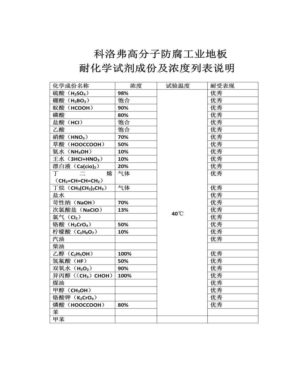 真能扛住浓硫酸、NMP、DMAC、四氢呋喃吗?重防腐地板为什么厉害 (卷材防腐工业地坪) 科洛弗重防腐工业地板(工业地坪)是一种采用特殊高分子材料为原材料通过高温热压成型的卷材地板,此地板采用成品卷材铺装,具备防油性、抗污性、抗腐蚀、防水防潮、施工工期短维修简单、耐磨性好、抗静电、重载、能过叉车、环保无毒、可回收再利用等优点! 科洛弗重防腐工业地板(工业地坪)(卷材防腐工业地坪),可经受叉车、卡车长期碾压,使地面重度耐腐蚀、耐强酸碱、耐化学溶剂、耐冲击、防地面龟裂。 适用范围:制药厂、化妆品厂、食品厂、化学实验室、化工厂、制药厂、化学实验室、电镀厂、电池厂、等场所的地面。采用卷材成品铺装,可以耐受NMP、DMAC、乙酸乙酯、四氢呋喃、98%浓硫酸、70%硝酸、饱和盐酸、高浓度氢氟酸、酮类、苯类、碱等90%以上常见高浓度化学溶剂。 厂房地面常受化学制剂的侵袭,最容易产生表面刮花、溶解、空鼓开裂现象。坑洼打滑的地面对于仪器设备和工作人员的安全都是不小的隐患。为厂房地面更换更耐腐蚀、更牢固止滑的安全耐酸碱地板是不容回避的问题。 科洛弗重防腐工业地板(工业地坪),特种优质高分子材料制成,耐受多种多样的化学制剂,无论身处何种浓度的腐蚀环境中,都能稳定胜任、保持自身材质不受影响并保护原始地面,同时具有高耐油性,面对重油环境亦有良好的抵御作用。高度耐油、耐酸碱腐蚀、抗老化、使用寿命长的特点有效促进了工作效率的提高、保障了工作生产的安全。 科洛弗重防腐工业地板(工业地坪),集耐酸碱地板、耐油地面角色于一身,耐受稀酸、稀碱液或强酸、强碱以及其它化学药品,也能在油类(机油、柴油、汽油、润滑油)介质中工作,具有耐油、耐酸碱、耐寒热、耐老化等性能。 科洛弗防腐蚀工业地板,同时具有很好的密封性和防滑性。对于防潮防水的要求亦能满足得非常好。 科洛弗高分子防腐工业地板可耐受的各种化学试剂浓度: 硫酸(H2SO4) 98% 硼酸(H3BO3) 饱合 蚁酸(HCOOH) 90% 磷酸 80% 盐酸(HCI) 饱合 乙酸 饱合 硝酸(HNO3) 70% 草酸(HOOCCOOH) 50% 氨水(NH4OH) 10% 王水(3HCI+HNO3) 10% 漂白液(Ca(cio)2) 20% 丁二烯(CH2=CH=CH=CH2) 气体 丁烷(CH3(CH2)2CH3) 气体 盐水 苛性纳(NaOH) 70% 次氯酸盐(NaCIO) 13% 氯气(CI2) 铬酸(H2CrO4) 50% 柠檬酸(C5H8O7) 10% 汽油 柴油 乙醇(C2H5OH) 100% 氢氟酸(HF) 100% 双氧水(H2O2) 90% 异丙醇((CH3)CHOH) 100% 煤油 甲醇(CH3OH) 铬酸钾(K2CrO4) 燐酸(HOOCCOOH) 80% 苯 甲苯 酮 科洛弗重防腐工业地板其它功能特性 1、抗菌防霉:采用抗菌配方生产,可有效抑制细菌生长滋生。 2、防静电:独特的防静电配方使地板具备优异的防静电性能。 3、抗低温:可在-30℃低温下正常使用而不开裂、不脆化且耐磨抗重载。 4、防止地面产生裂缝:优异的抗拉伸性可防止因基层的开裂而产生地面裂缝。 5、抗重载可走叉车:高分子材料的高致密特性使地板可满足叉车等重型运载工具通行使用。 6、绿色环保:生产高分子工业地板主要原料不含放射性元素。 7、成品安装:施工简易,维修相当简单。 8、防火阻燃:质量合格的高分子工业地板防火指标可达B1级,B1级为除天然石材外最高的防火级别。 9、吸音防噪:有普通地面材料无法相比吸音效果,其吸音可达12-20分贝。 10、超强耐磨:医院、学校、办公楼、商场、超市、交通工具等场所,高分子工业地板越来越受欢迎。 11、高弹性和超强抗冲击:质地较软弹性较好,脚感舒适远超水磨石,环氧等 12、超强防滑:特殊防滑性,与普通材料相比,在粘水的情况下脚感更涩,更不容易滑到,越遇水越涩。 13、超轻超薄:不超过1.5mm厚度,每平米 13 重量仅1-2KG,不足普通地面材料5%。对楼体承重和空间节约,有无可比拟优势。 14、裁剪拼接简单容易:美工刀就可任意裁剪,可以不同花色材料组合;生活空间成为一座艺术殿堂。 15、安装施工快捷:安装施工非常快捷,不用水泥砂浆,成品直接安装,无挥发物产生,24小时后就可以使用。 16、环保可再生:当今是一个追求可持续发展的时代,新材料新能源层出不穷,高分子工业地板是能再生利用的地面装饰材料,这对于保护我们的地球自然资源和生态环境具有巨大的意义。 17、超级防污性、易清洁性 内容来源:读者投稿 仅为资讯分享!不代表华闻之声CNS的认同、推荐和建议 自行分辨 谨慎选择 责任编辑:胡宇春