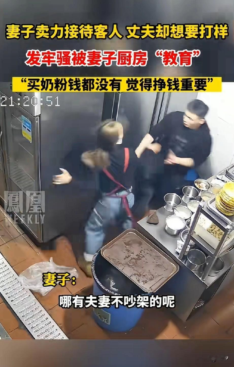 夫妻之间哪有不吵架的? 饭店内的监控一幕, 直接让大家惊呆了, 原来是妻子在外面尽力接客, 招待着进来的食客, 但她的老公却躲在后厨, 只想打烊收工, 这可把妻子气坏了, 对着不成才的老公一顿骂, 说孩子奶粉都没有着落, 你说挣钱重不重要? 说完之后不解气, 对着老公踹了一脚, 老公虽然很生气, 但是全程没有还手, 因为他知道老婆只是生气, 他也没有怨恨自己的老婆, 他知道老婆是为了这个家好, 夫妻之间闹点矛盾很正常, 重要的是自己的男人宠着自己, 夫妻双方肯定要有方吃亏, 如果双方都不吃亏, 那这个家庭就存在不下去了, 大家觉得妻子动手是不是太过了? 夫妻相处,最怕的是什么 夫妻吵架感悟 两口子吵架日记 夫妻搞笑互怼