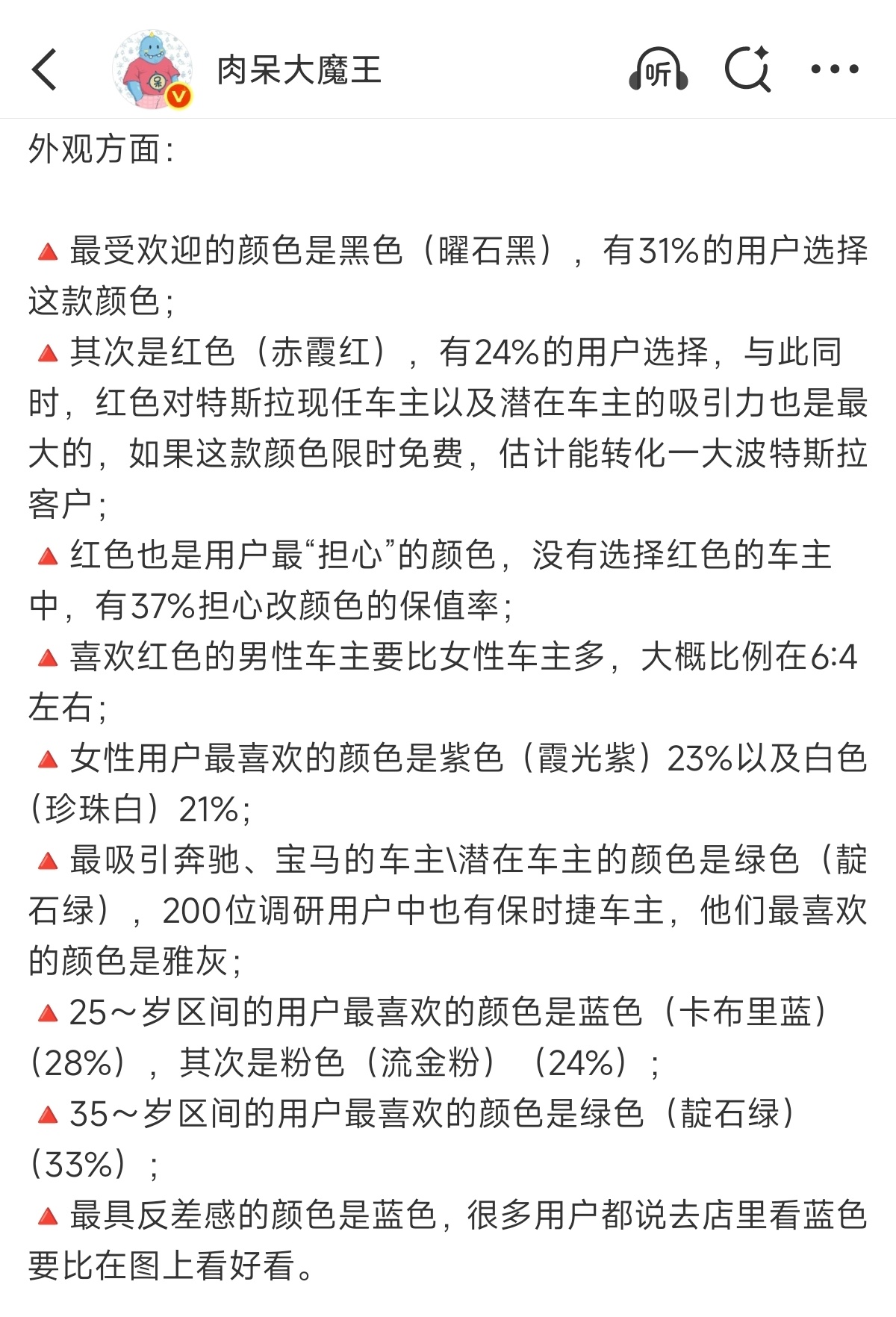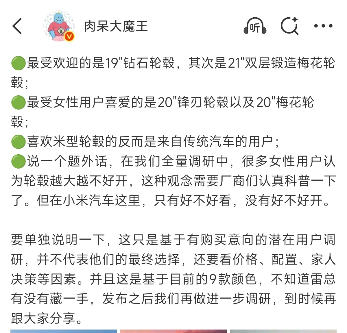 小米新SU7潜在车主意向调研这个调研结果还挺意外的,没想到大家最喜欢的颜色是曜石黑,喜欢赤霞红的男生比女生多,而且最受欢迎的轮毂是钻石轮毂而不是梅花轮毂……