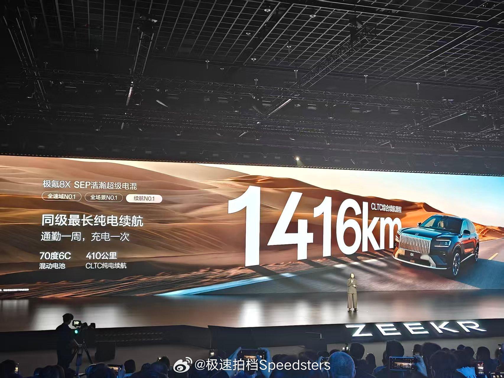 极氪8X配备超1400匹马力的三电机「兆瓦电驱」,满电零百2.96秒,馈电也才3.16秒