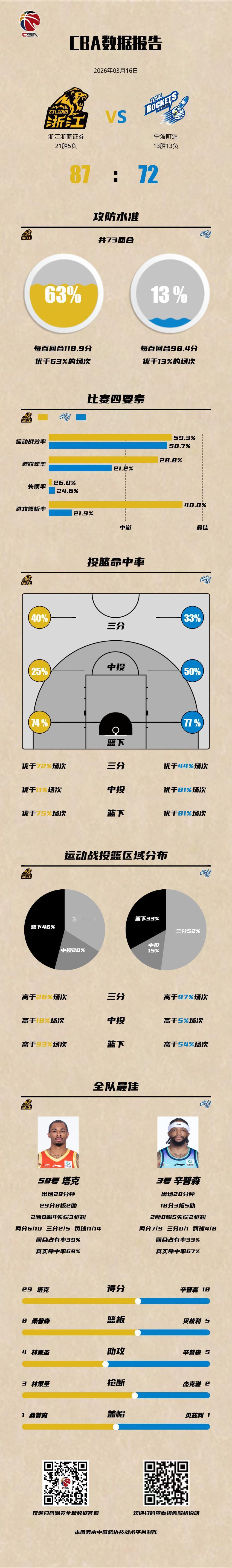 浙江浙商证券 87-72 宁波町渥 广厦男篮vs宁波男篮 浙江浙商证券:塔克29分8篮板2抢断,胡金秋16分3篮板,桑普森14分8篮板2抢断; 宁波町渥:辛普森18分3篮板5助攻2抢断,戴昊11分3助攻,李安11分。以城之名