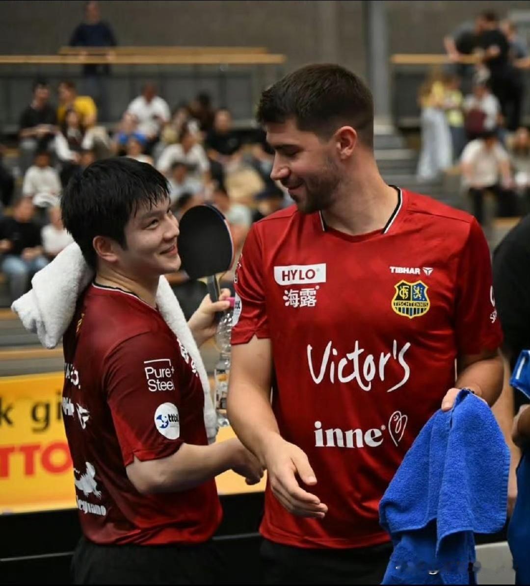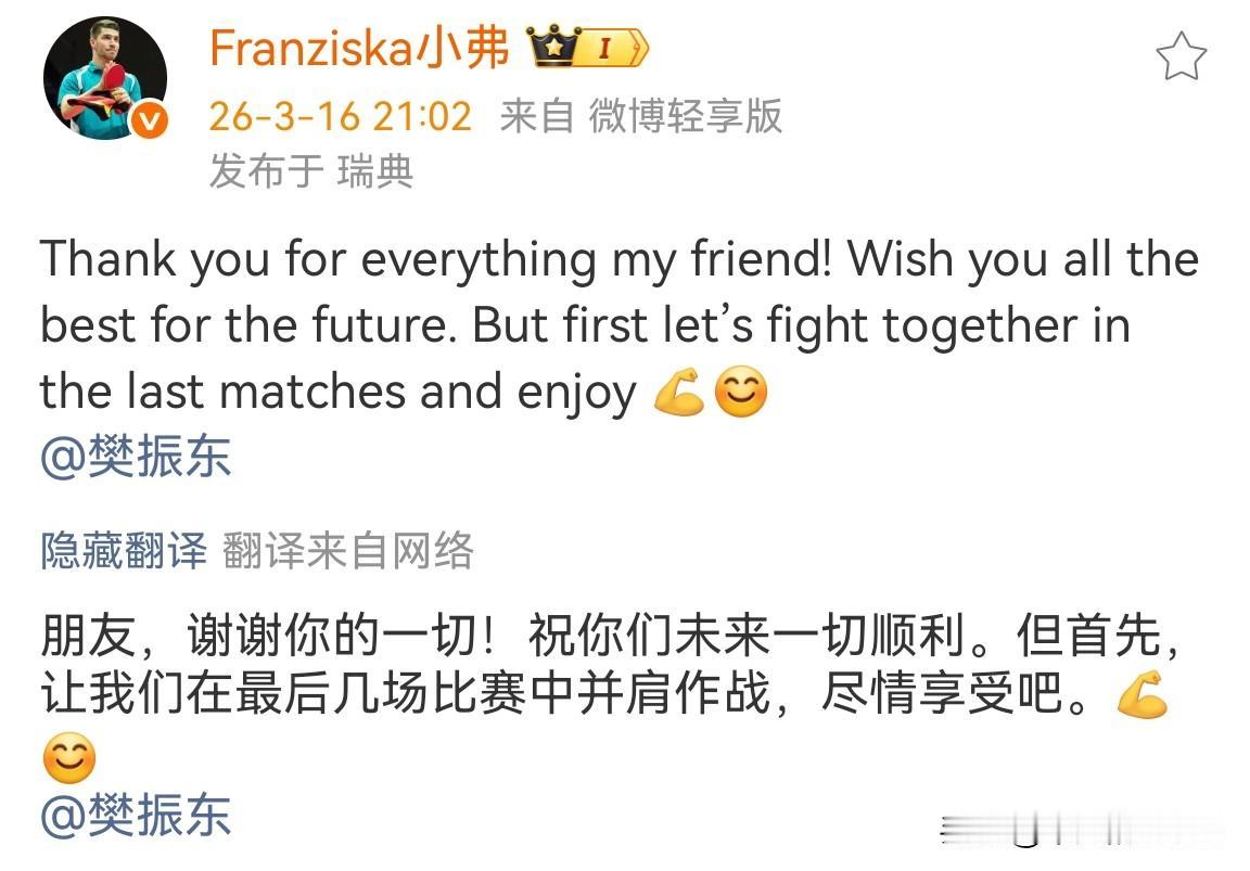 3月16日,小弗队长发文说:“谢谢你所做的一切,我的朋友!祝你未来一切顺利。但眼下,先让我们一起奋战最后几场比赛,好好享受吧。” 弗朗西斯卡发了一张与樊振东的合照,两人都身着红色队服,相视一笑,脸上满是灿烂的笑容。 除了教练以外,波尔和小弗队长都给予了东东许多帮助,尤其是语言方面。 东东每次看到小弗队长换衣服都会害羞,笑死我了。 祝樊振东和小弗队长友谊长存,虽然将来彼此会成为对手,但两人结下的友情是不会变的,大家觉得呢?