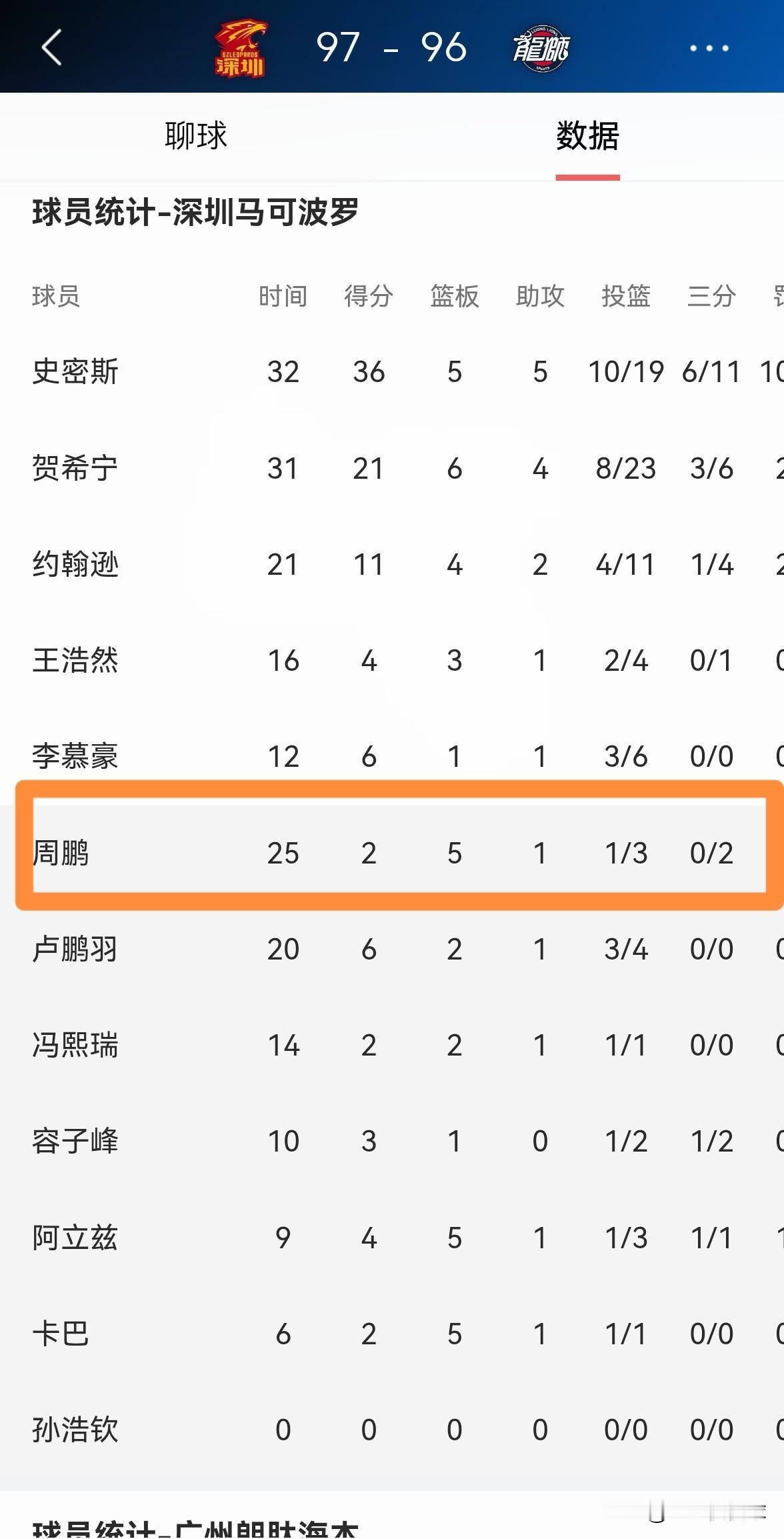 深圳马可波罗老将周鹏真是不复当年之勇了!虽然今天深圳马可波罗在主场以97:96险胜广州朗肽海本,但是老将周鹏的进攻状态非常一般,他在替补出战的25分钟里,投篮3中1,其中三分球2中0仅仅得到2分,不过有5篮板,他的场上正负值为-7。 说实话,作为一名征战赛场多年的老将,周鹏确实不复当年之勇了,周鹏真的到了为年轻人让位的时候了。