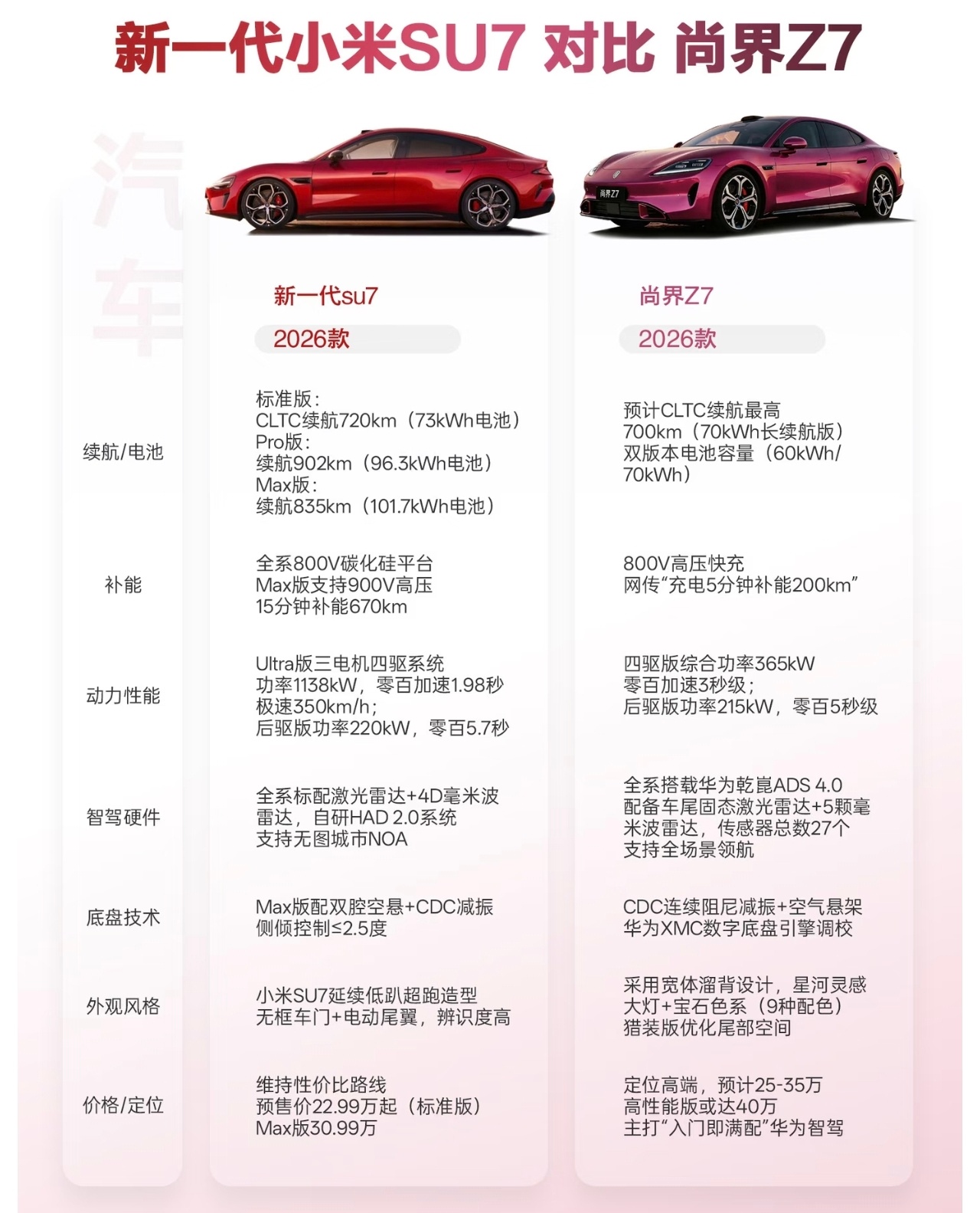 差了3公里的续航,尚界100度三元锂电池,小米96.3度磷酸铁锂电池,更小的电池实现接近的续航,意味着小米SU7的CLTC百公里综合电耗(约 10.68kWh)低于尚界Z7(约 11.05kWh)。当然,后续还是看实测吧,很有看头,感觉两家咬得很紧呀,真替小米捏一把汗,毕竟理想现在的情况,大家也看到了。